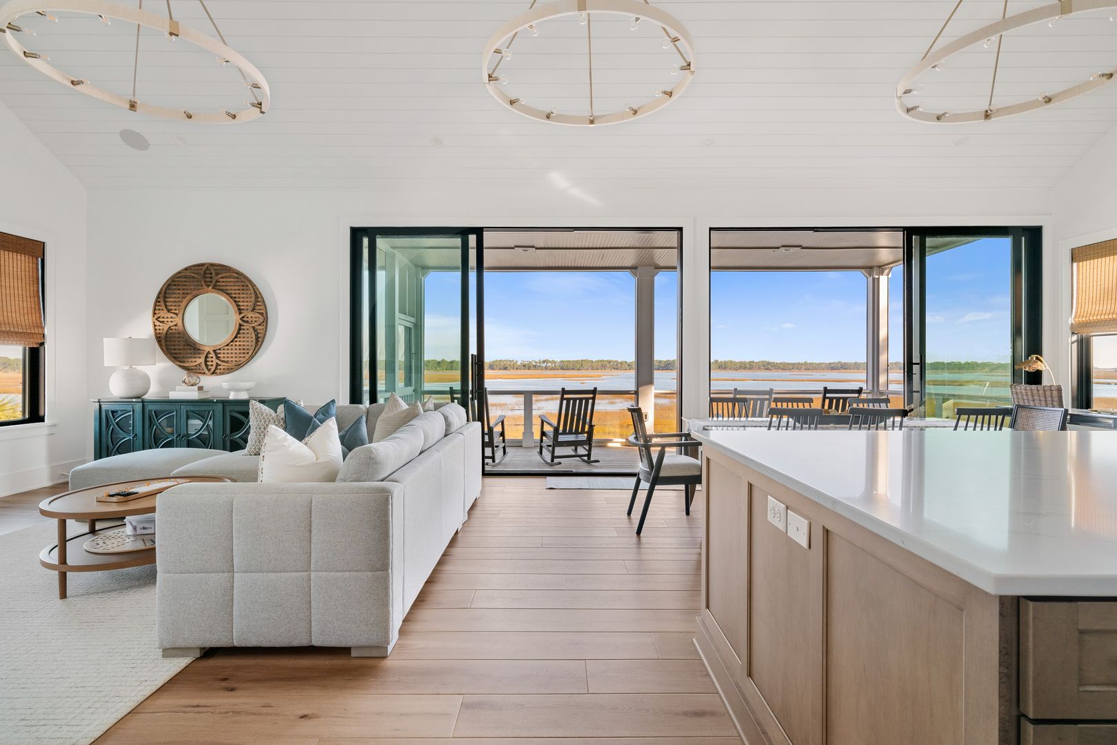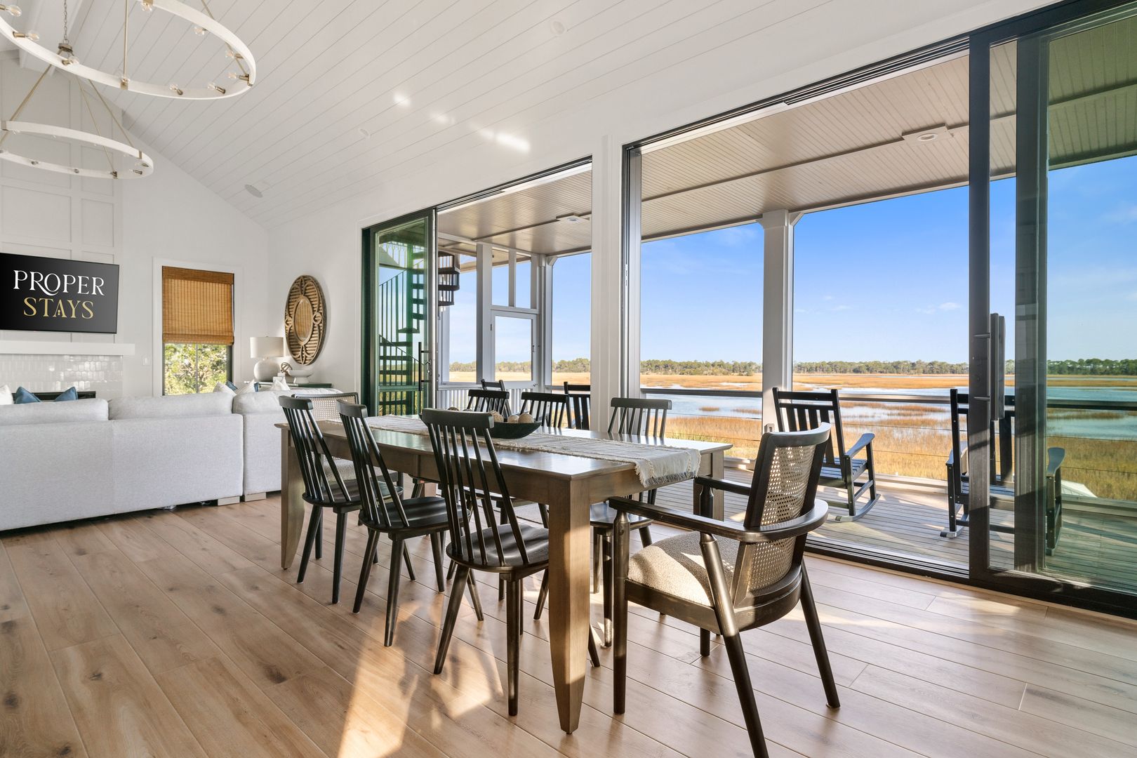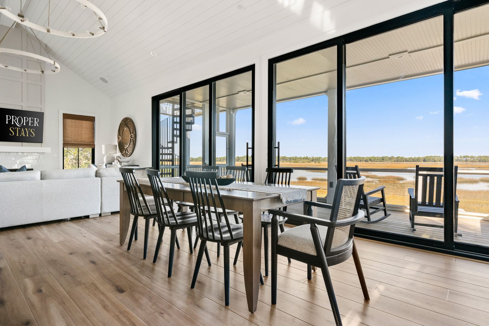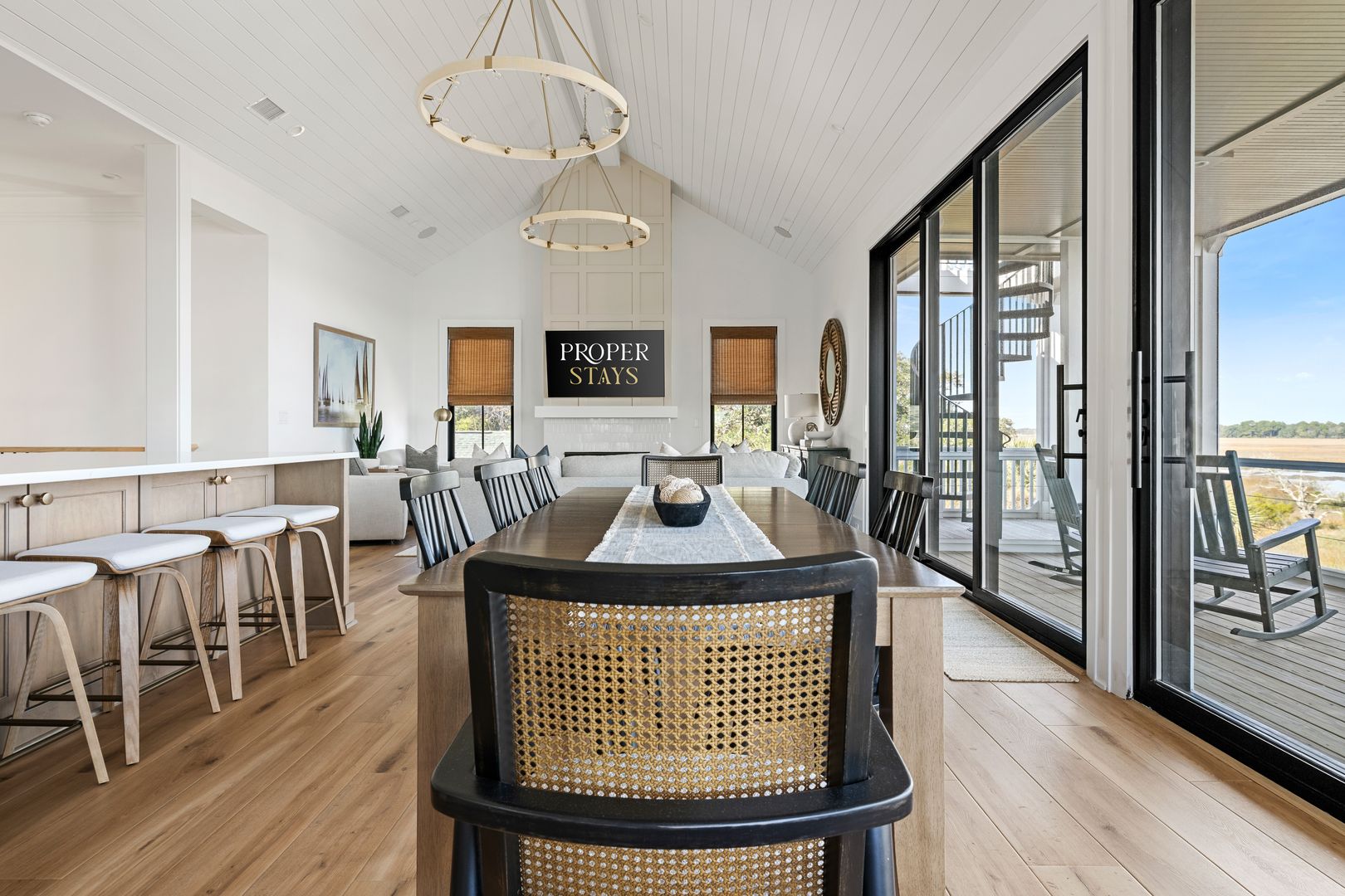 Upstairs, you’re greeted by the fourth bedroom, complete with a queen-size bed, dresser, smart TV, and an en suite bathroom featuring a double vanity and tiled shower. Beyond the bedroom, the home opens into a spectacular great room with soaring vaulted ceilings and dramatic sliding glass doors that frame uninterrupted views of the water and marsh. The living room, kitchen, and dining area flow together seamlessly, making this space ideal for gathering and entertaining. The living room is anchored by a comfortable sectional sofa, gas fireplace, and smart TV, while the dining area offers seating for eight. A thoughtfully placed desk sits in front of a window overlooking the water, creating an inspiring space to work or unwind.