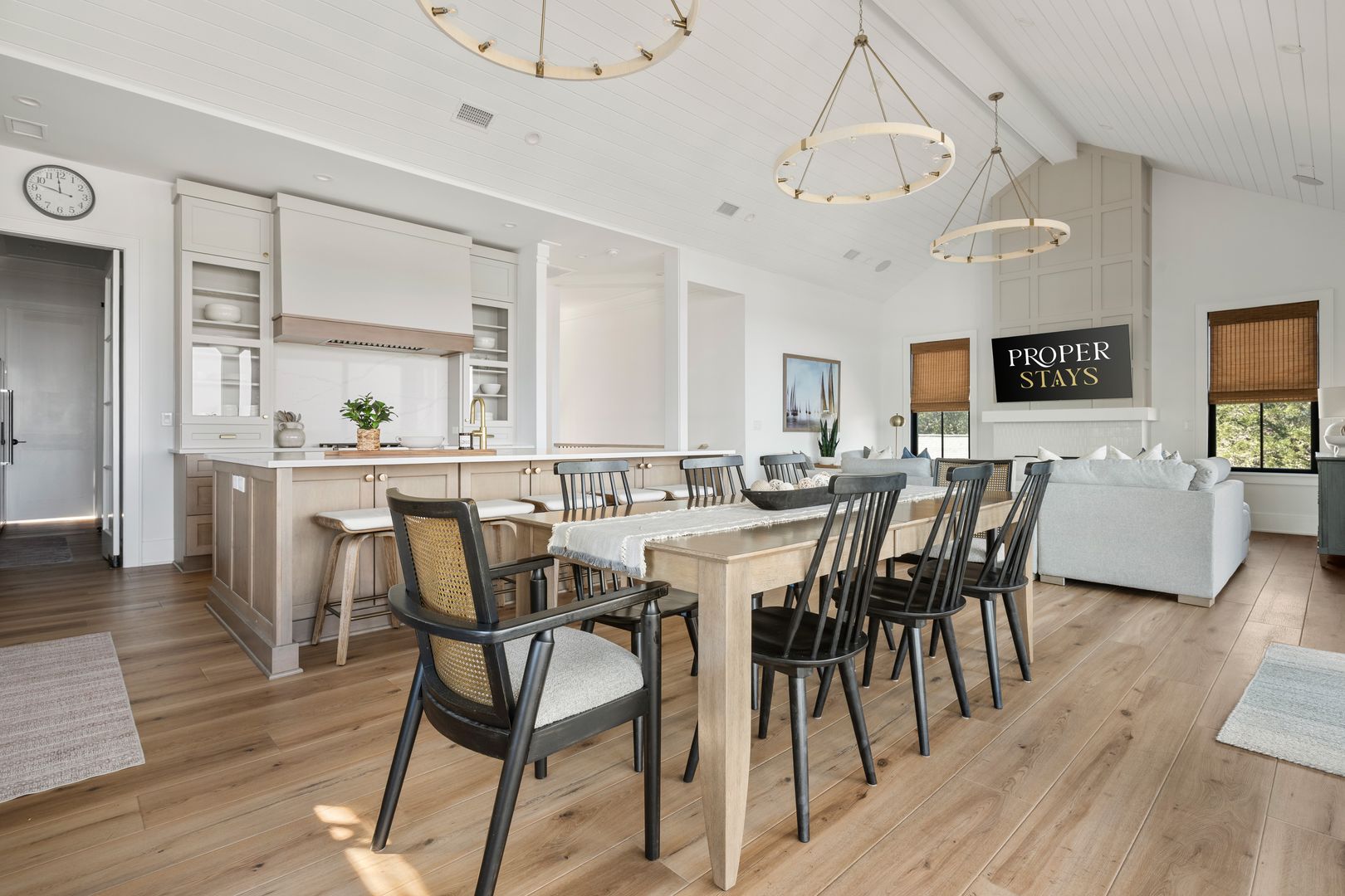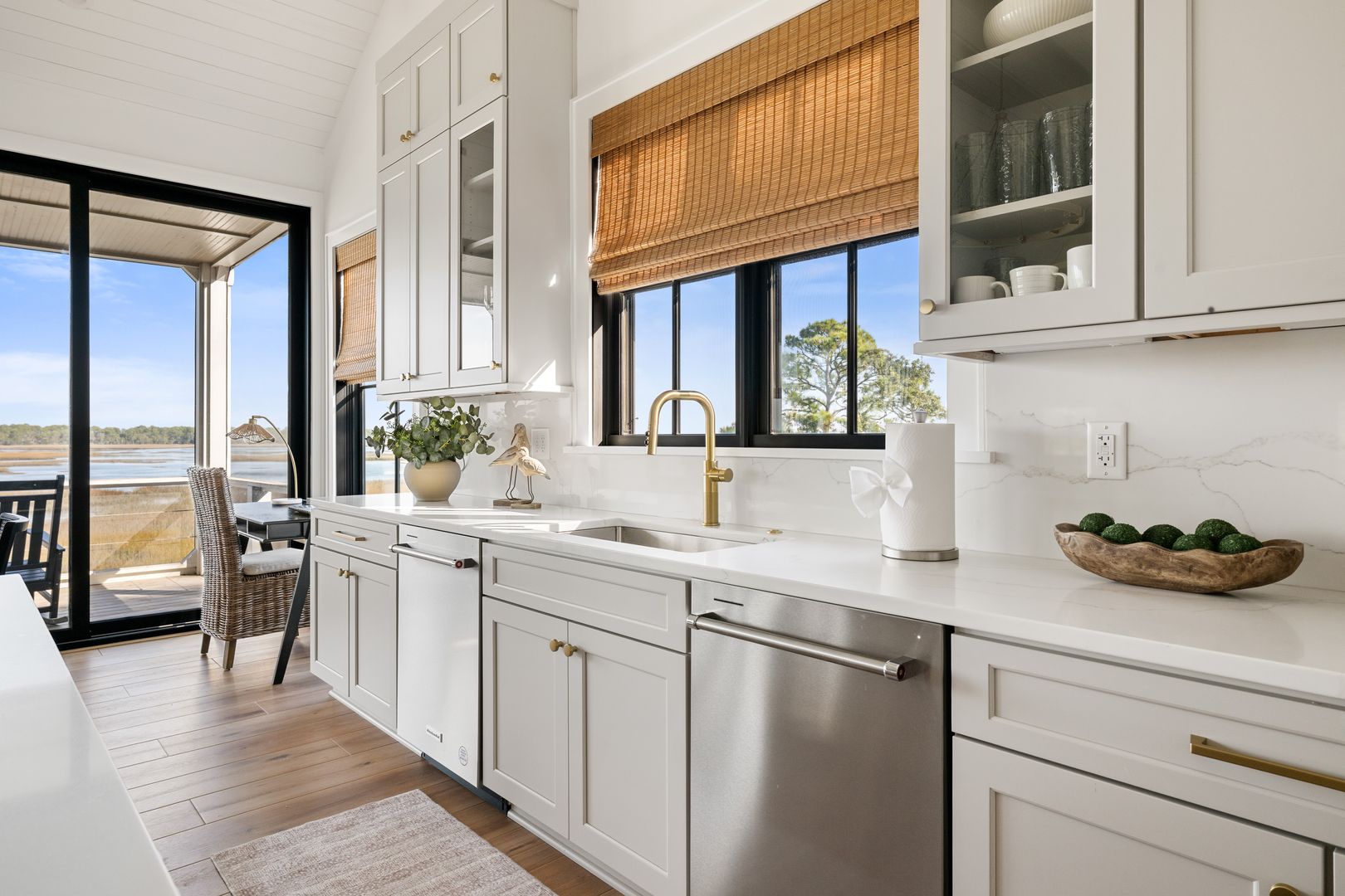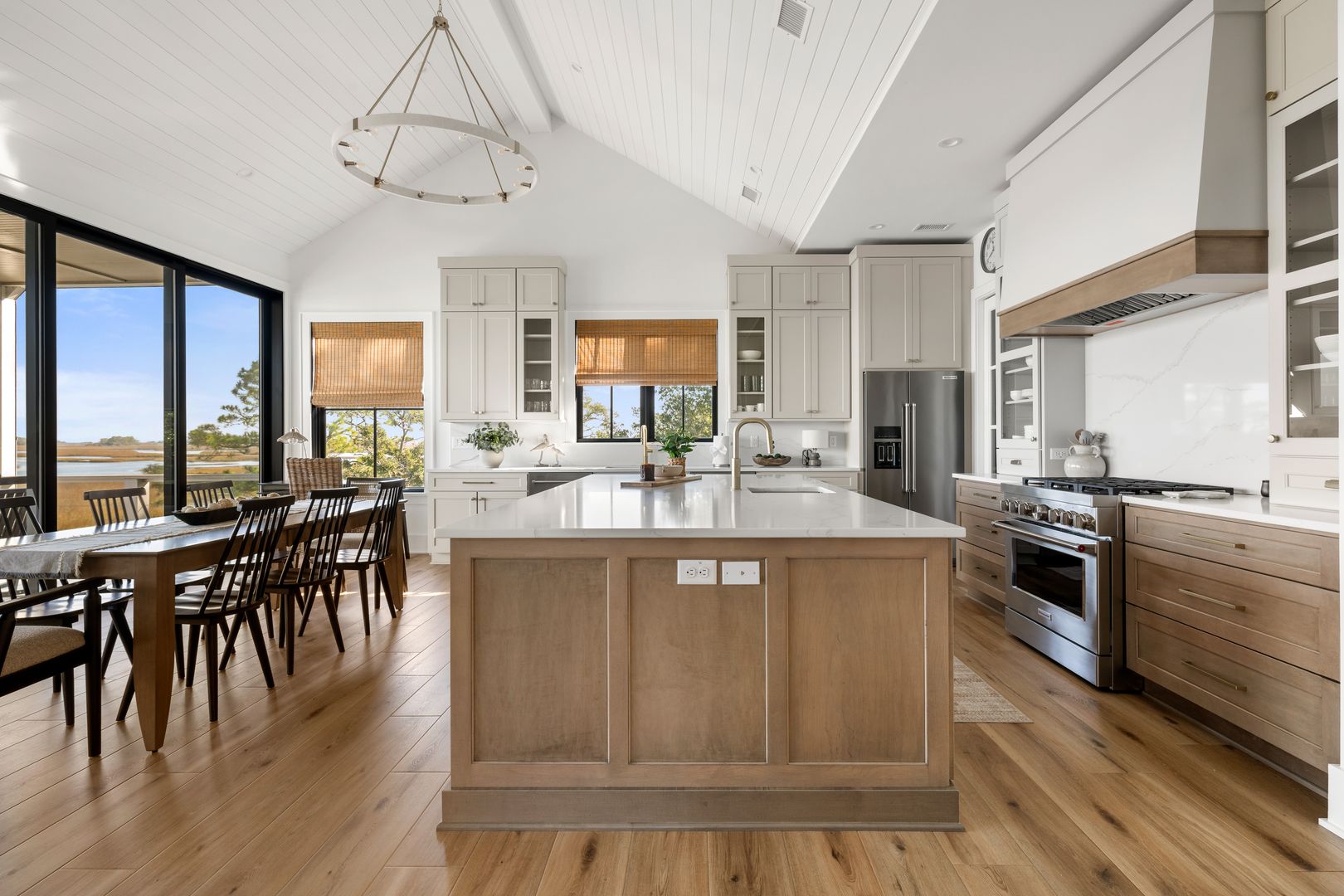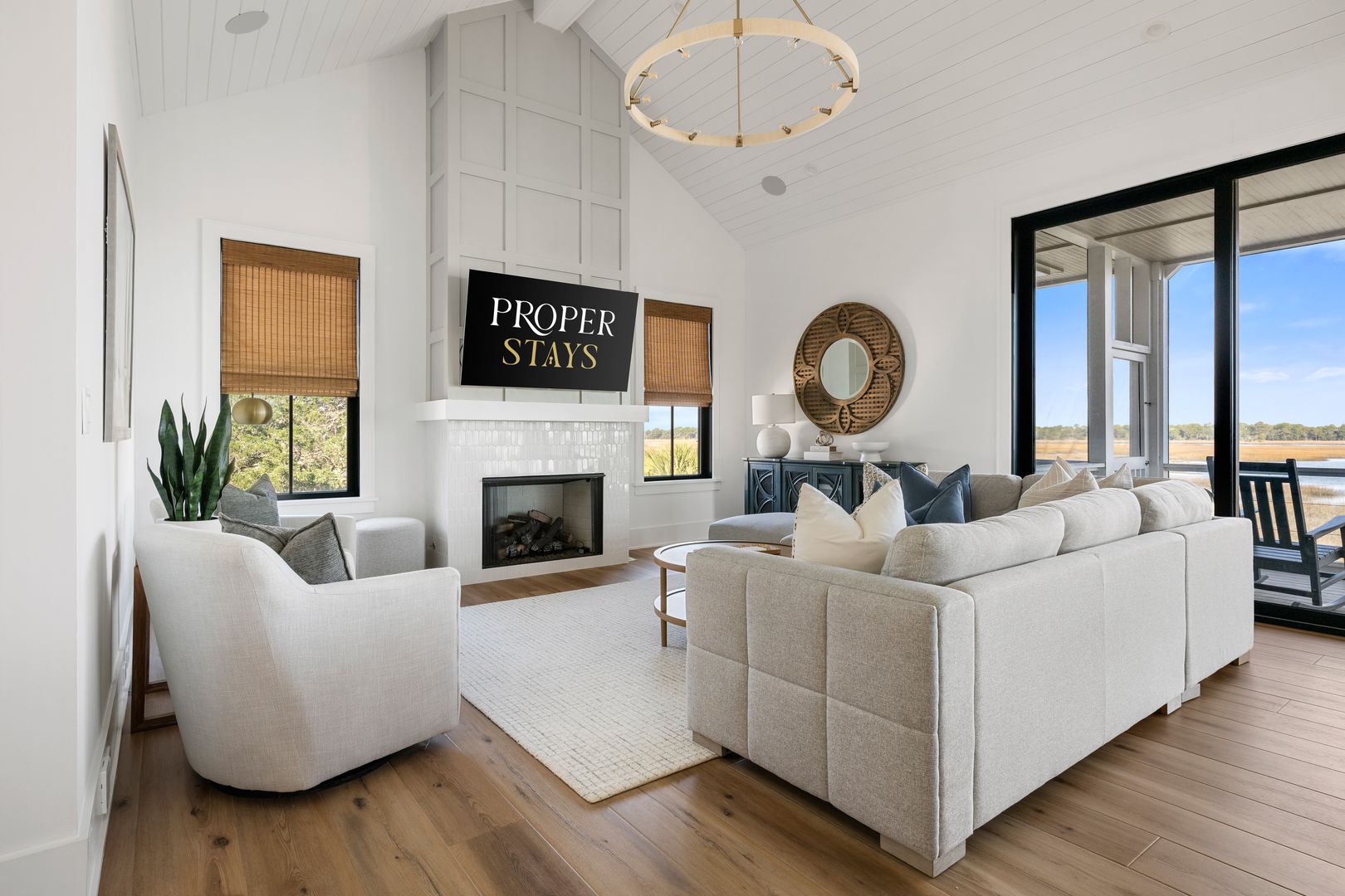 Upstairs, you’re greeted by the fourth bedroom, complete with a queen-size bed, dresser, smart TV, and an en suite bathroom featuring a double vanity and tiled shower. Beyond the bedroom, the home opens into a spectacular great room with soaring vaulted ceilings and dramatic sliding glass doors that frame uninterrupted views of the water and marsh. The living room, kitchen, and dining area flow together seamlessly, making this space ideal for gathering and entertaining. The living room is anchored by a comfortable sectional sofa, gas fireplace, and smart TV, while the dining area offers seating for eight. A thoughtfully placed desk sits in front of a window overlooking the water, creating an inspiring space to work or unwind.