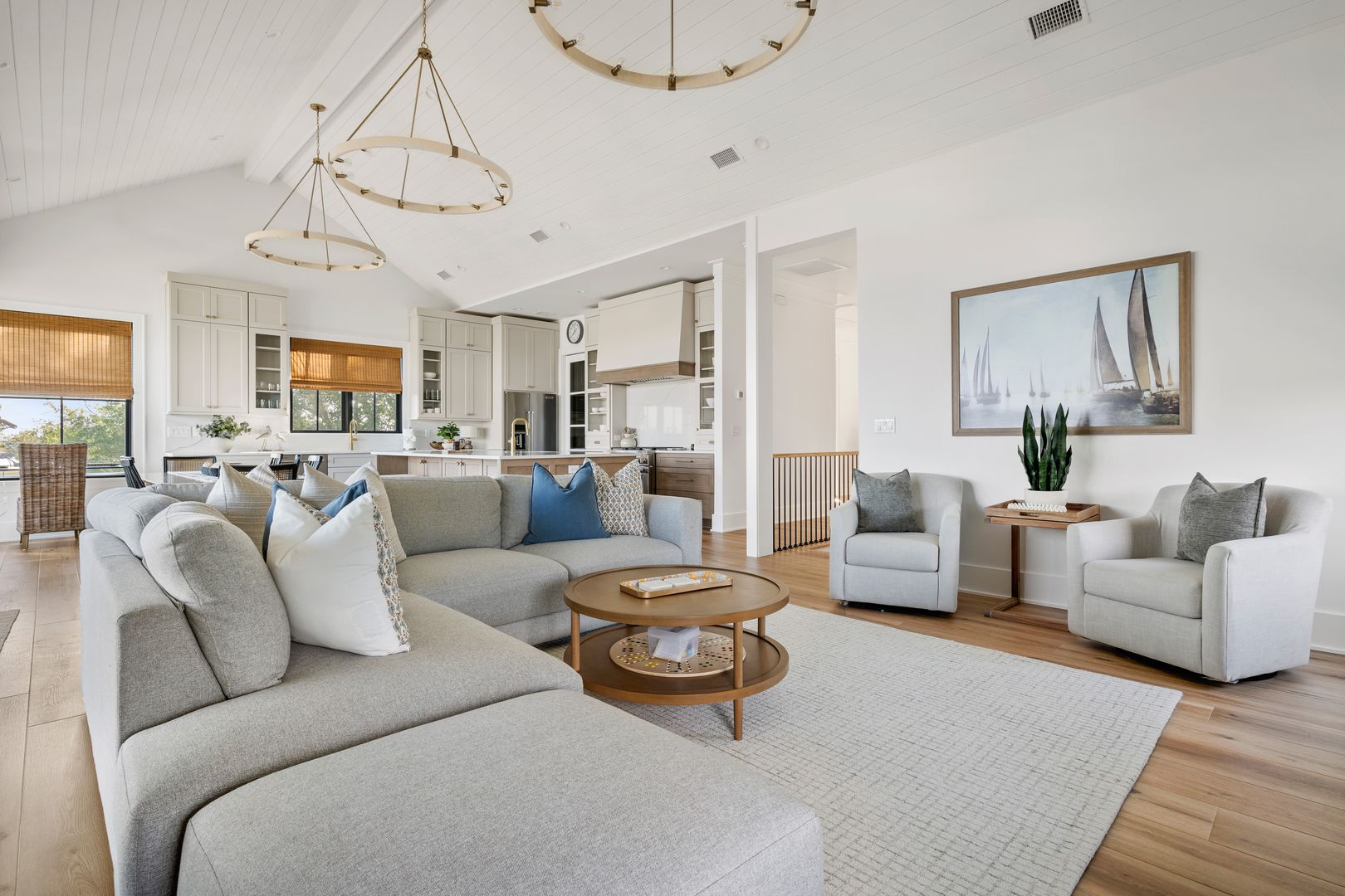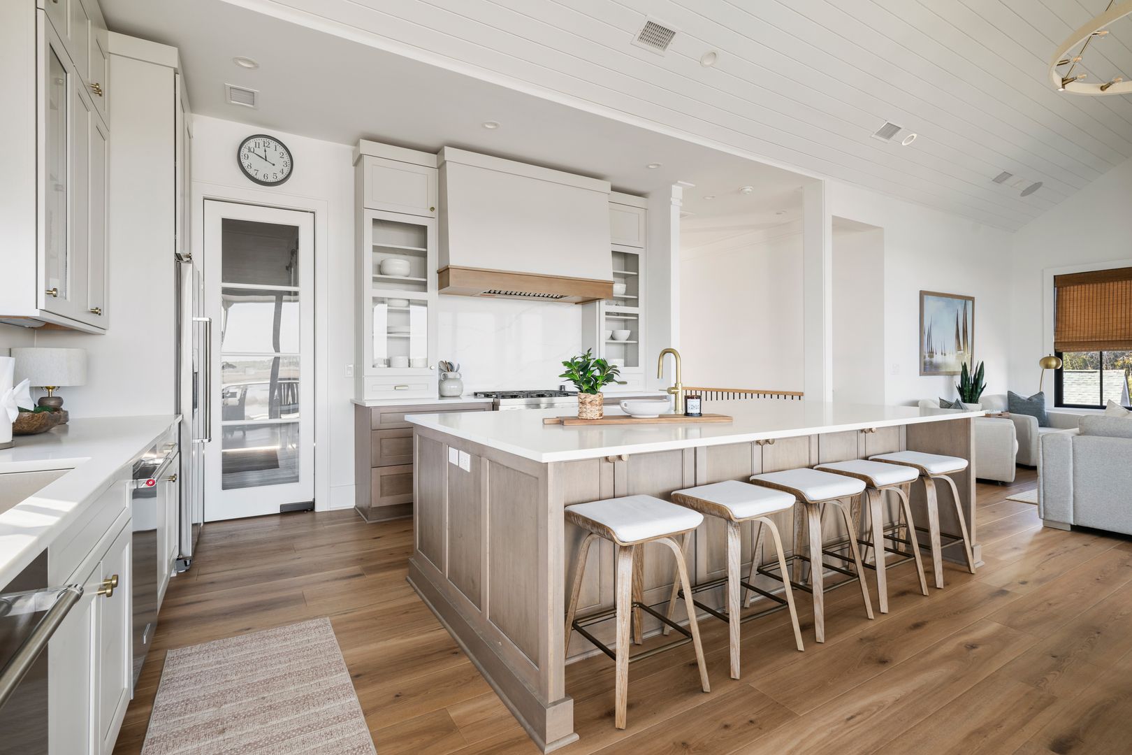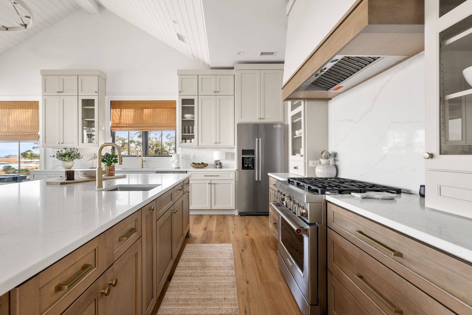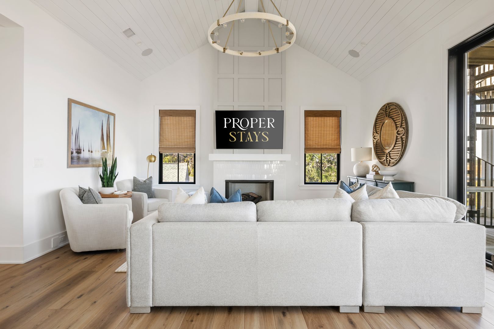 Upstairs, you’re greeted by the fourth bedroom, complete with a queen-size bed, dresser, smart TV, and an en suite bathroom featuring a double vanity and tiled shower. Beyond the bedroom, the home opens into a spectacular great room with soaring vaulted ceilings and dramatic sliding glass doors that frame uninterrupted views of the water and marsh. The living room, kitchen, and dining area flow together seamlessly, making this space ideal for gathering and entertaining. The living room is anchored by a comfortable sectional sofa, gas fireplace, and smart TV, while the dining area offers seating for eight. A thoughtfully placed desk sits in front of a window overlooking the water, creating an inspiring space to work or unwind.