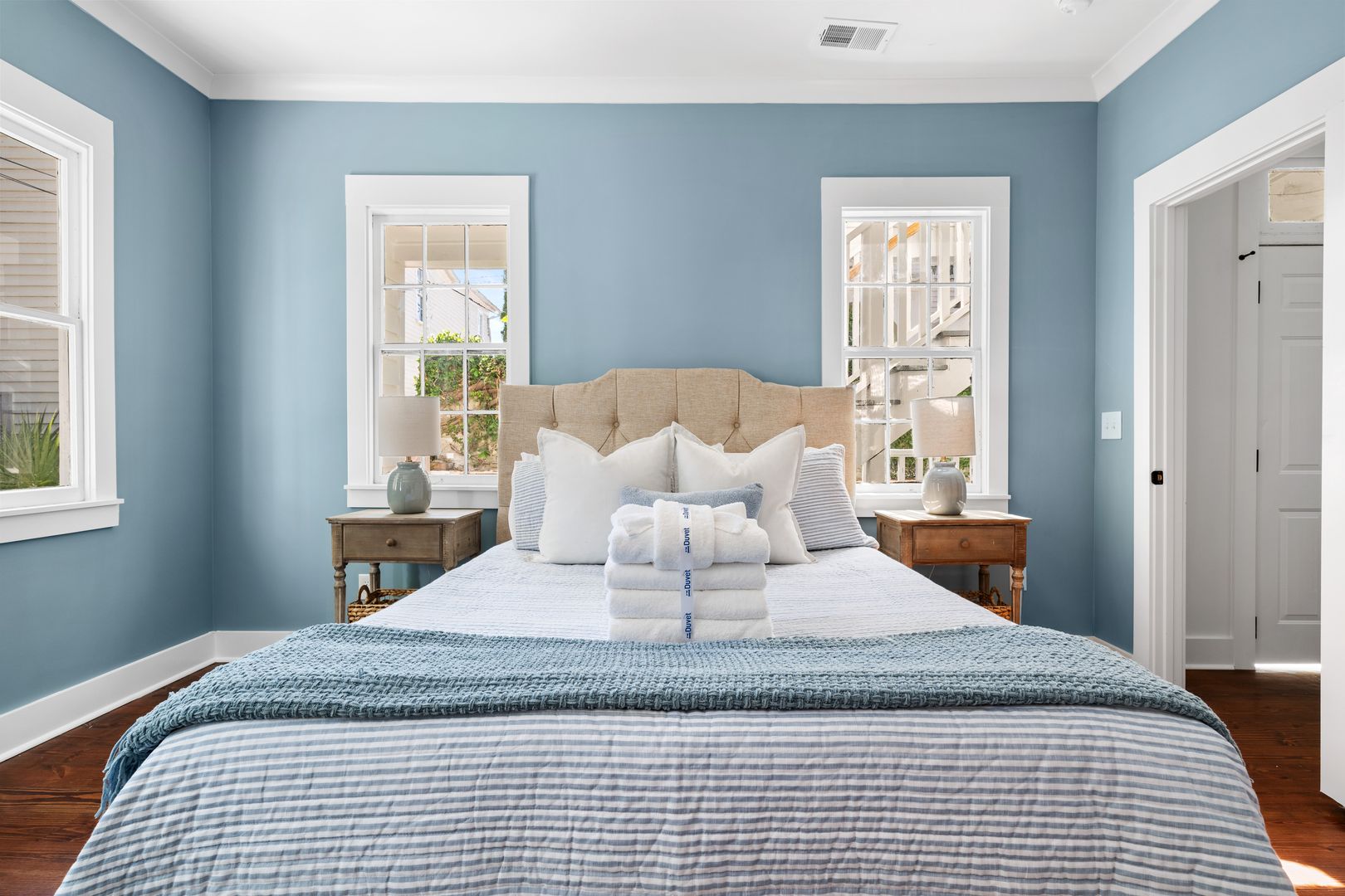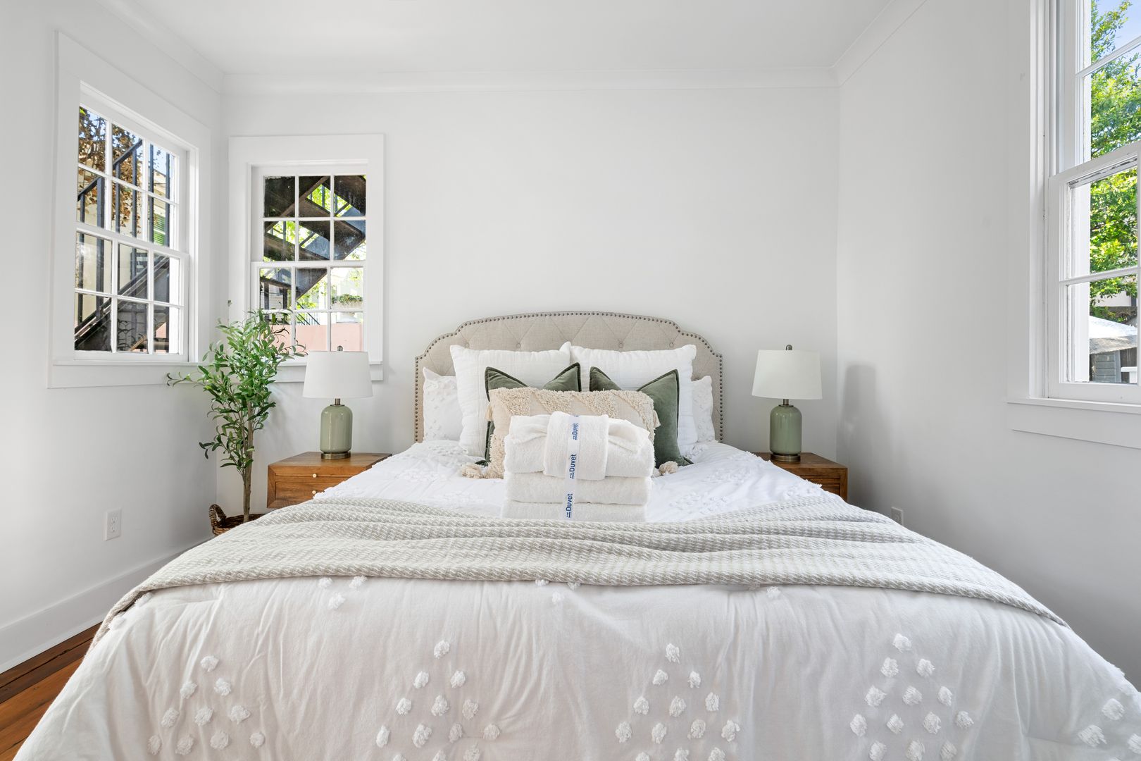 Inside, you'll find a light-filled living room with cozy seating that includes a plush couch and two armchairs—perfect for relaxing after a day exploring the city. The updated kitchen is a standout feature, complete with a tile backsplash, a full set of cooking essentials, and a dining table that seats four for meals at home or morning coffee. Each bedroom offers a queen-size bed, hotel quality linens, and closets.