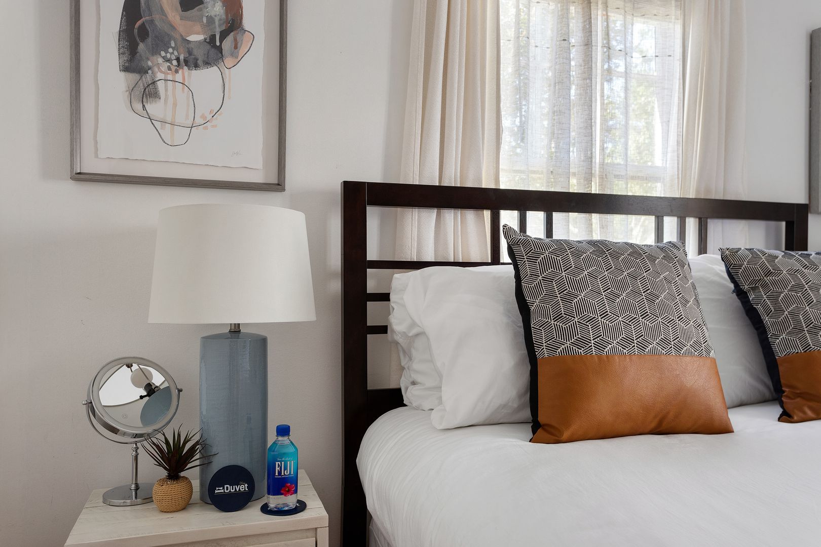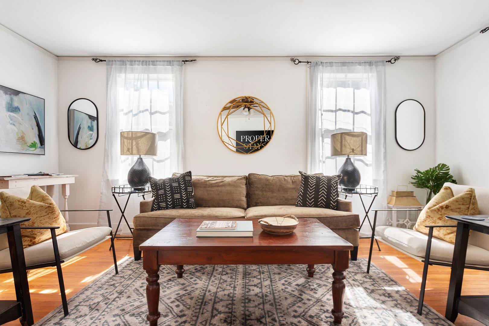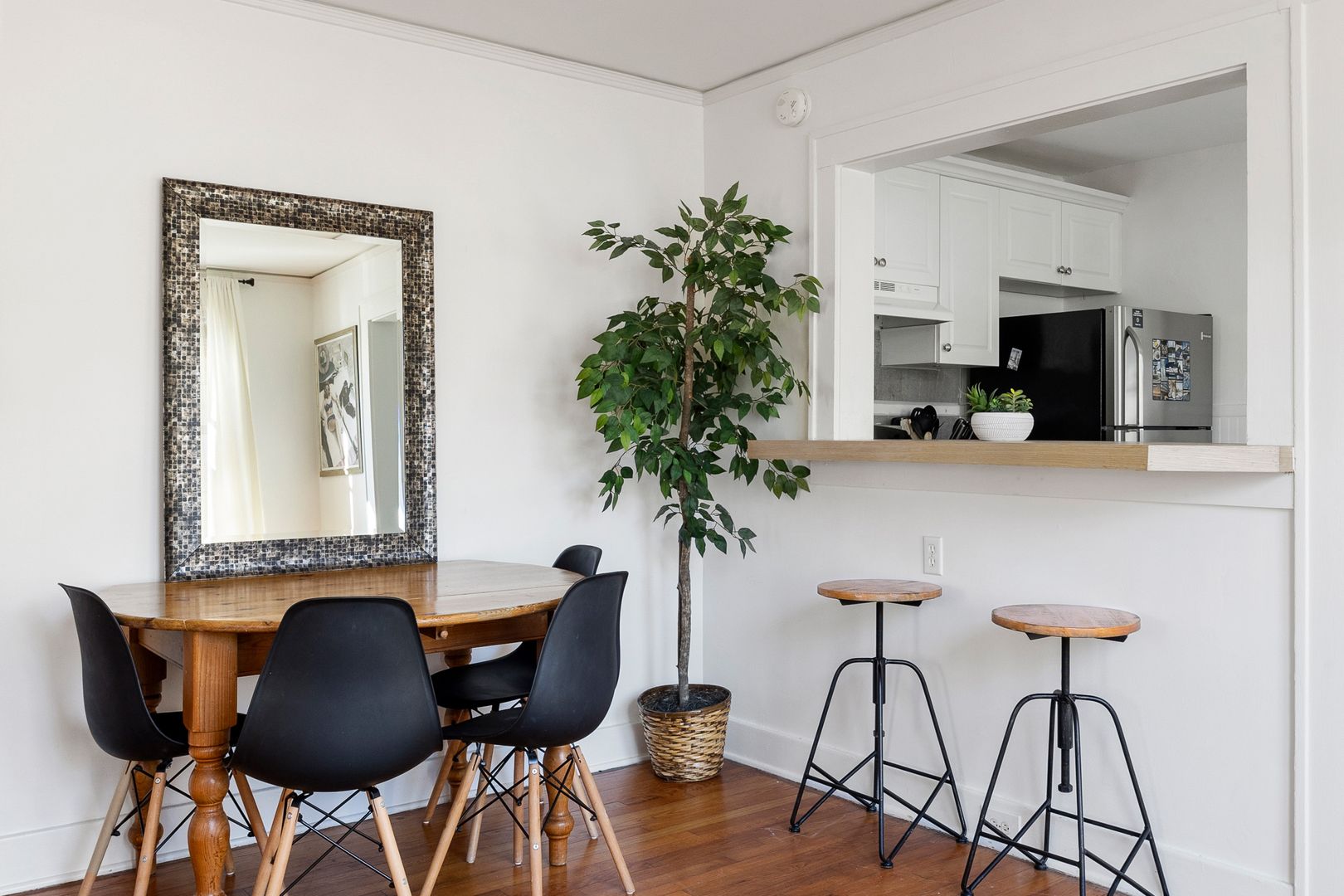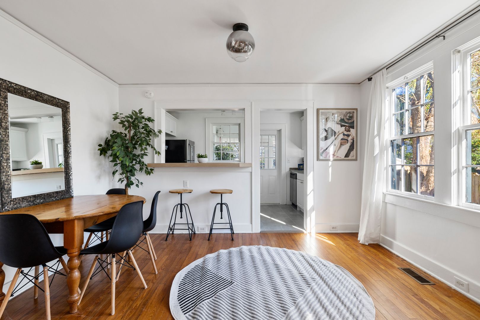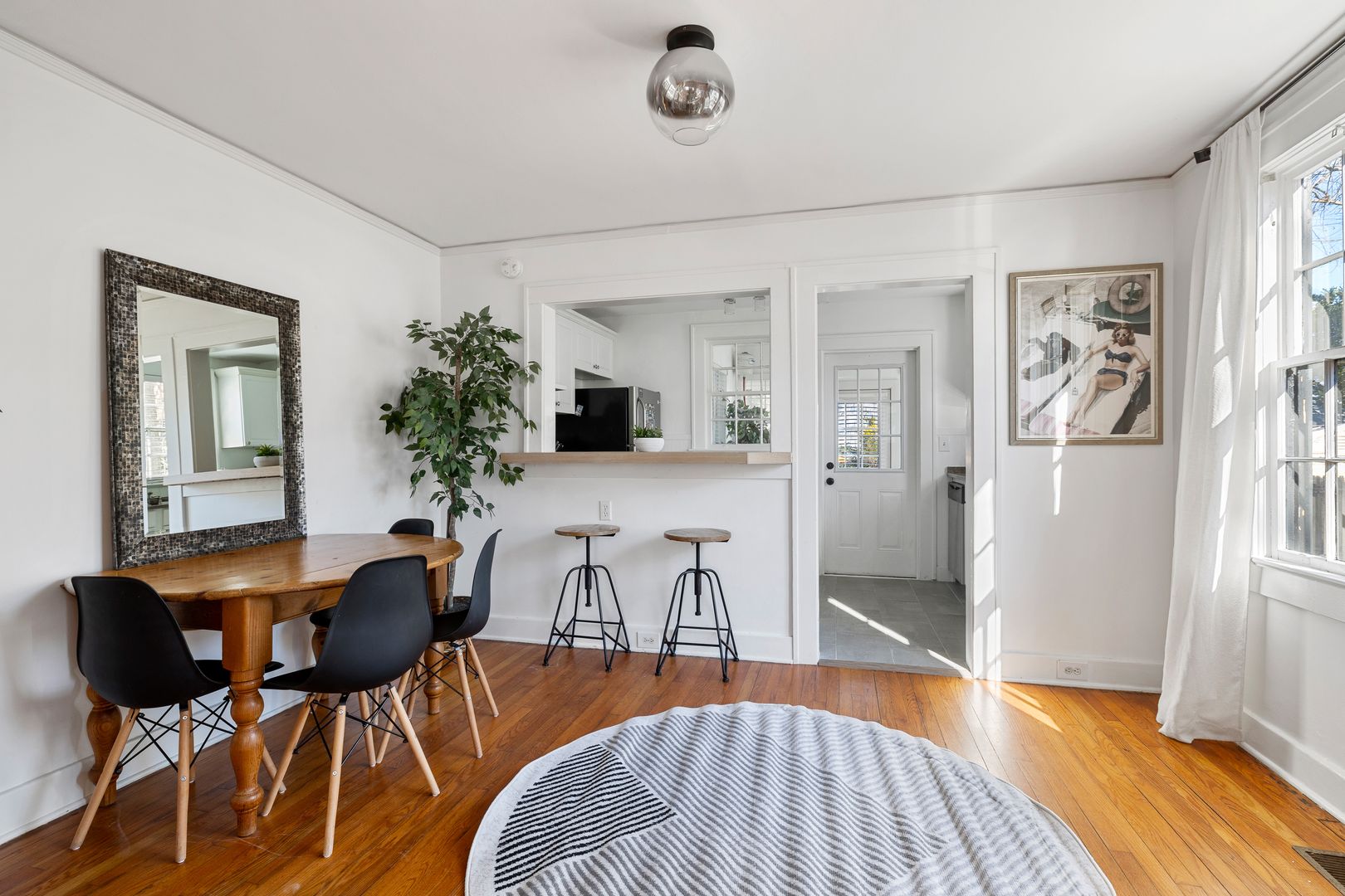 As you step inside, you’ll be greeted by an inviting living space bathed in natural light. Relax on the plush sofa or sink into one of the comfortable chairs while enjoying your favorite shows on the Smart TV. Adjacent to the living room, a chic dining area features a table with seating for four, making it an ideal spot for meals, work, or relaxation.