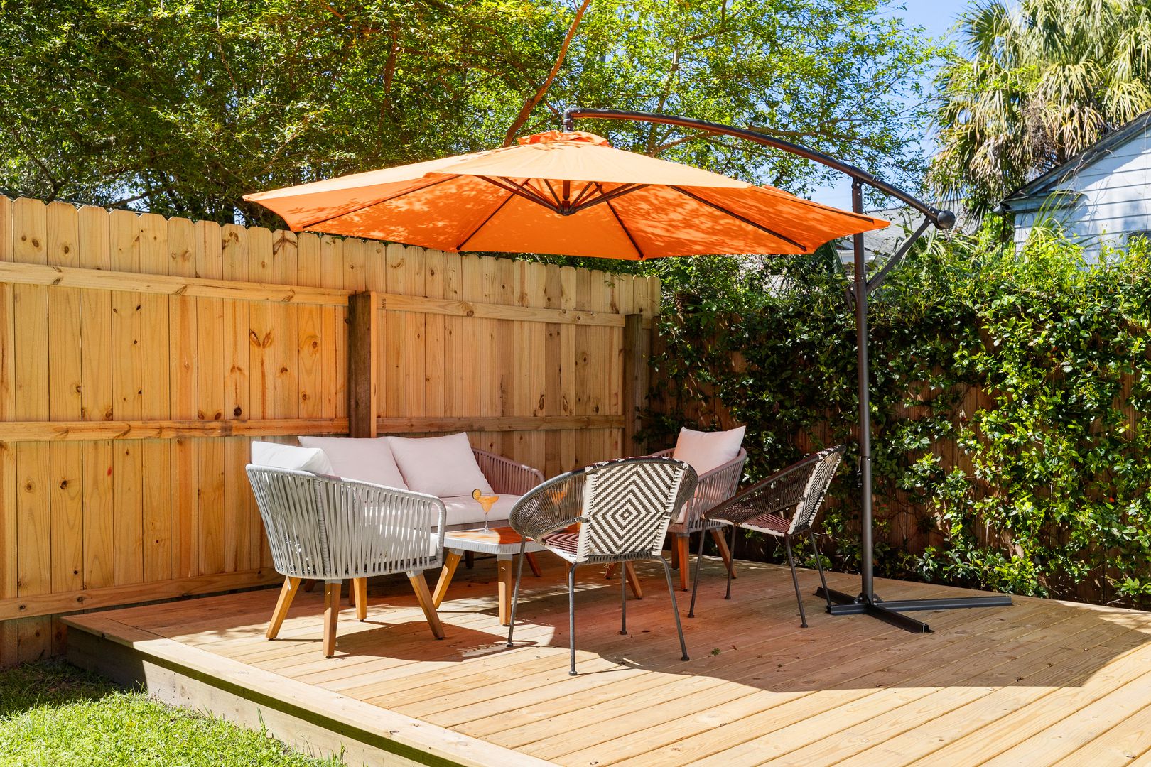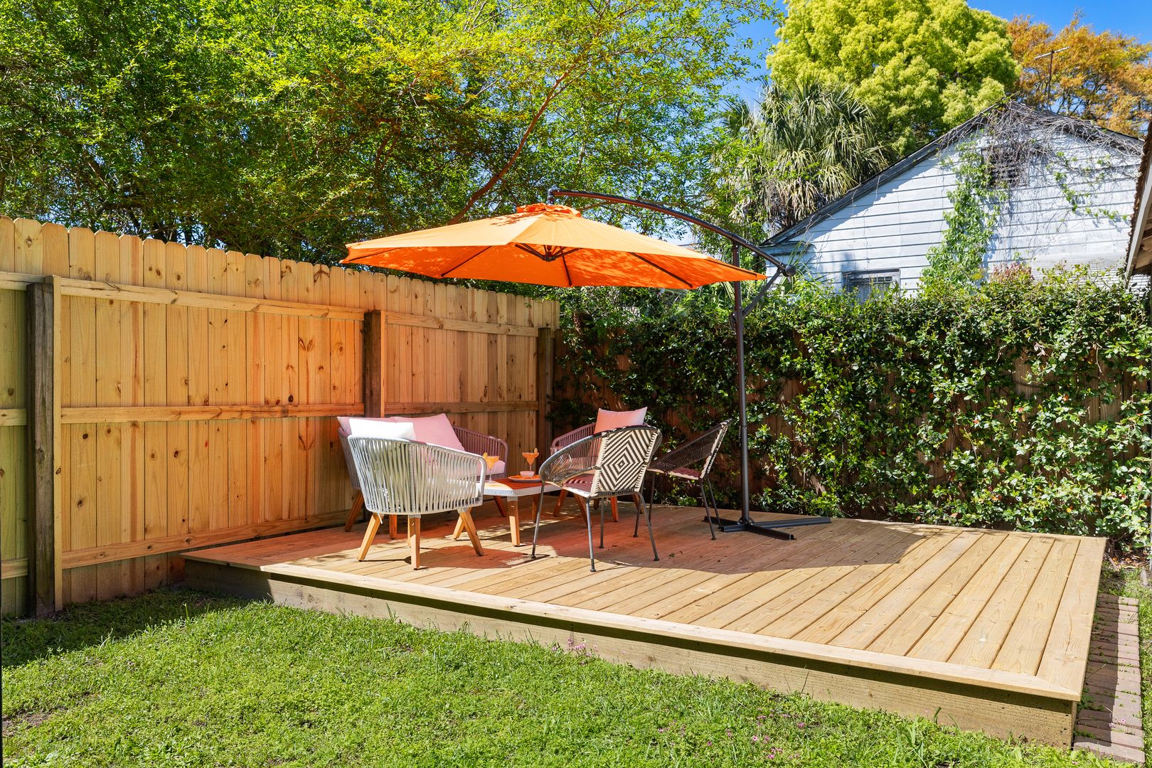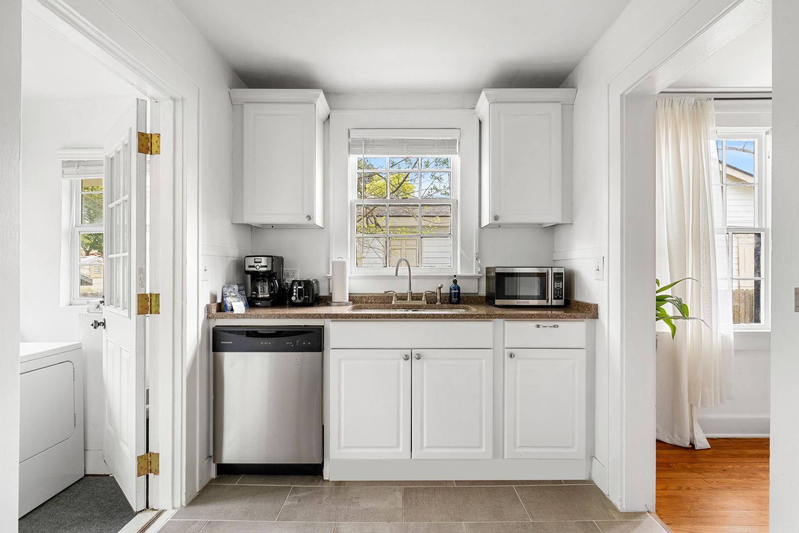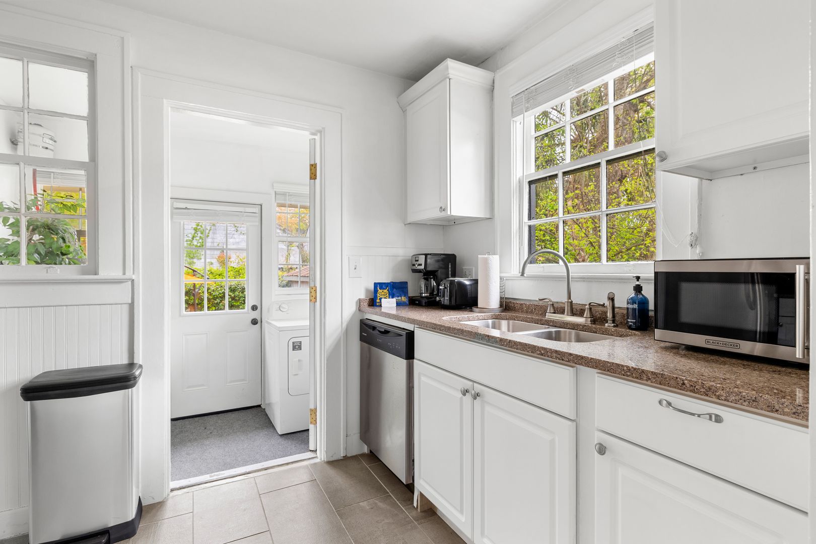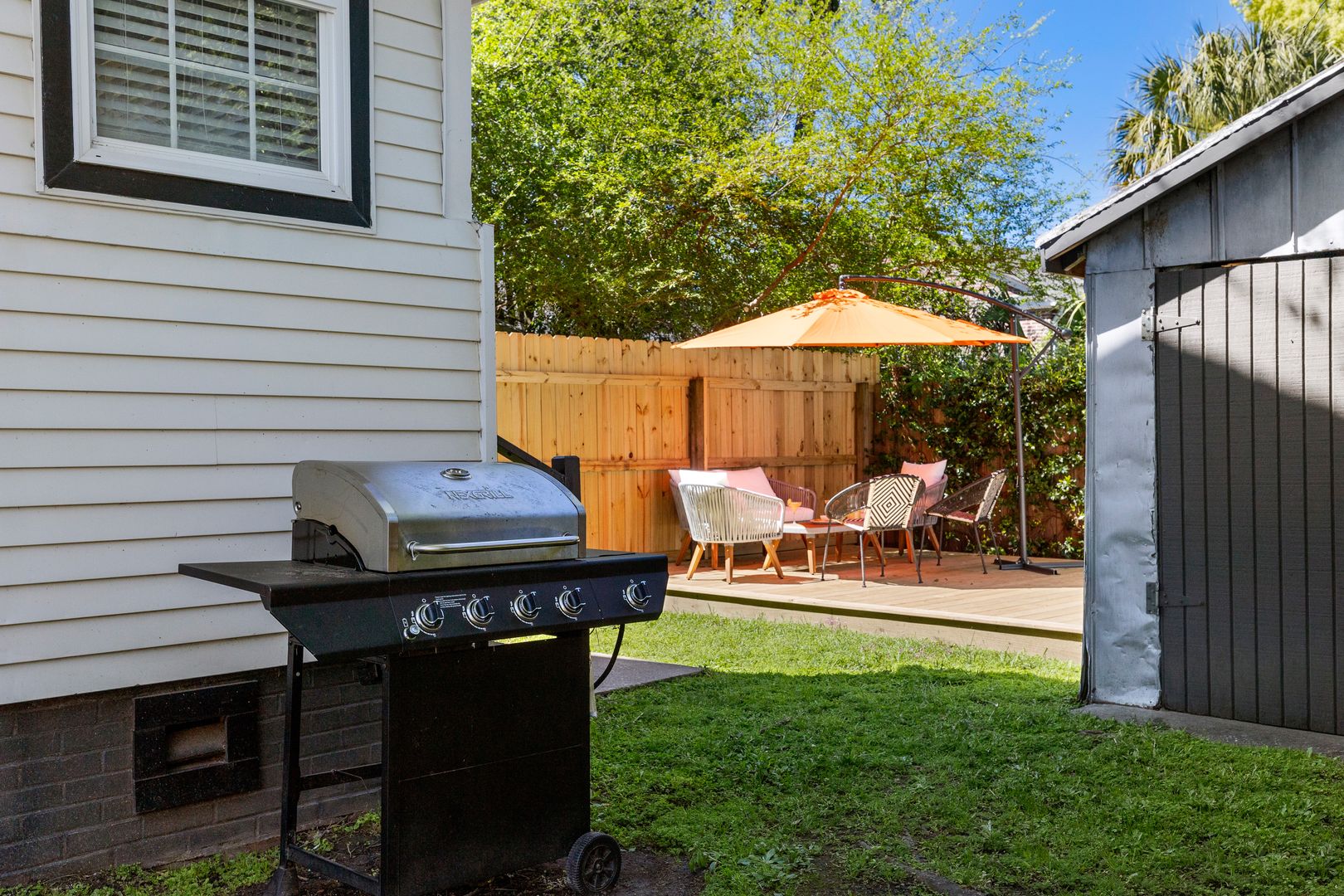 Conveniently located off the kitchen is a laundry room with a washer and dryer for your convenience. Just outside, you’ll find a private outdoor space that includes a spacious deck with seating, a grill, and a beautifully maintained yard—perfect for enjoying Charleston’s mild weather.
