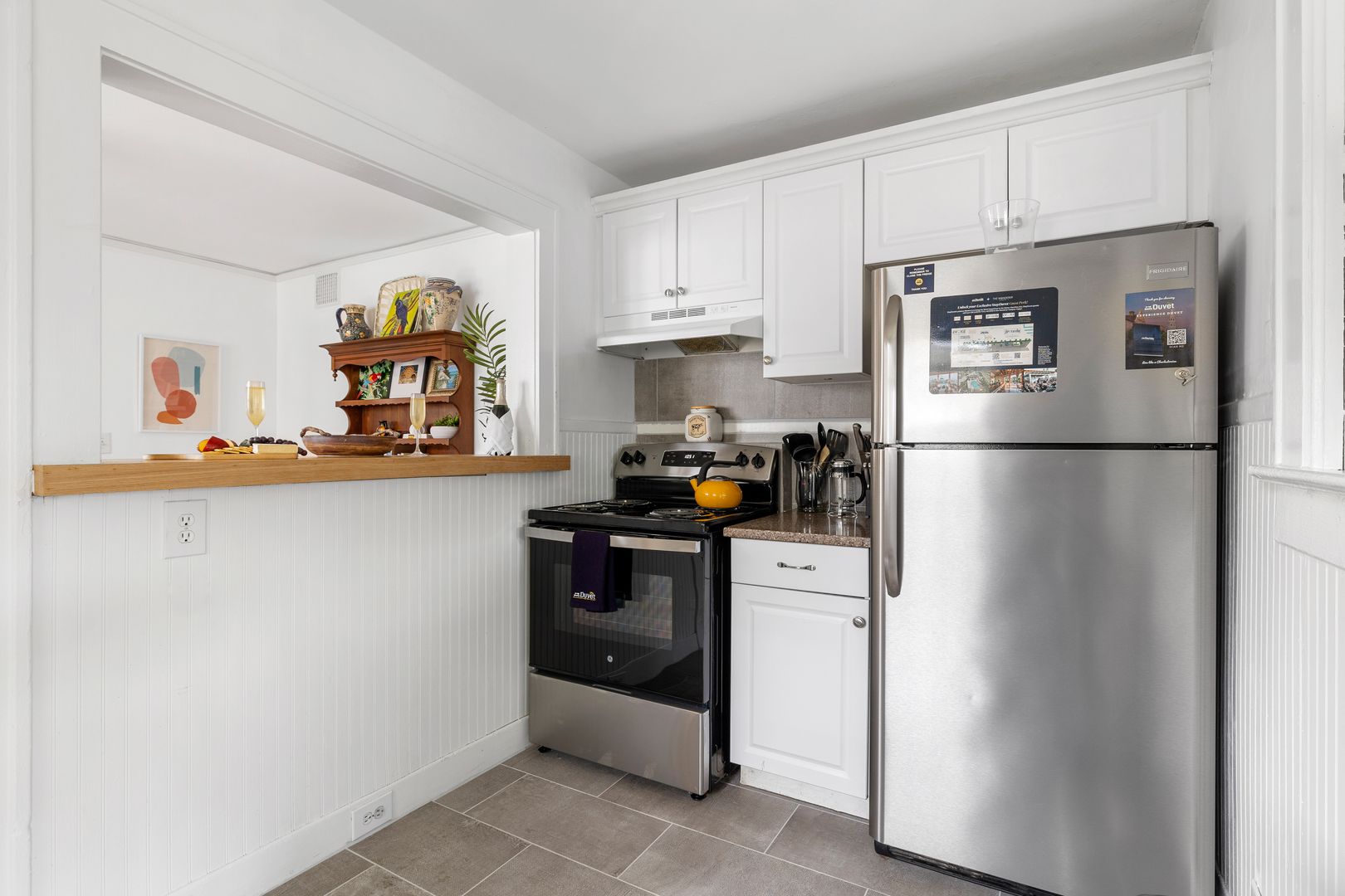 The fully equipped kitchen is outfitted with stainless steel appliances and stocked with everything you’ll need for cooking or entertaining. A countertop bar with seating for two provides the perfect place for casual dining or morning coffee.