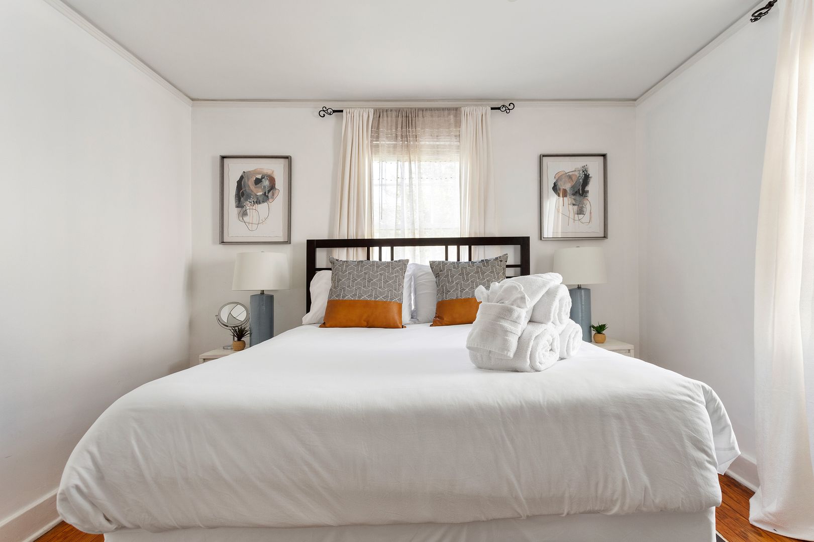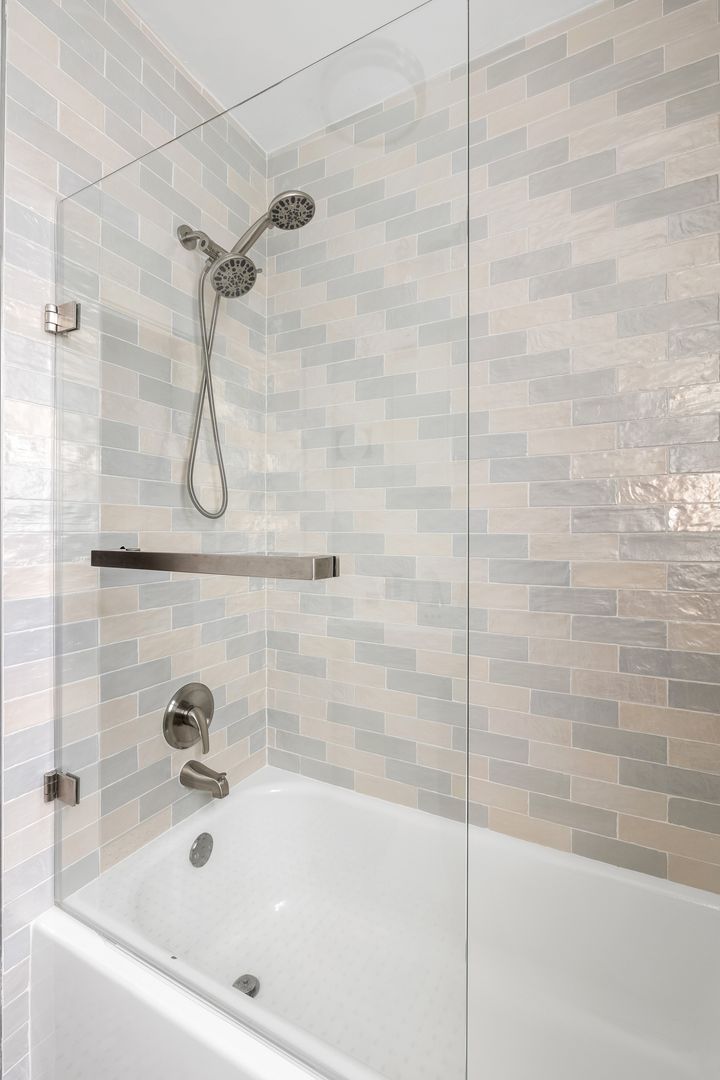 The apartment includes two thoughtfully furnished bedrooms. One features a luxurious king-size bed, a Smart TV, and ample closet space, while the second offers a cozy queen-size bed with plenty of storage. A sleek shared bathroom, located between the bedrooms, boasts a shower/tub combo with a glass enclosure.