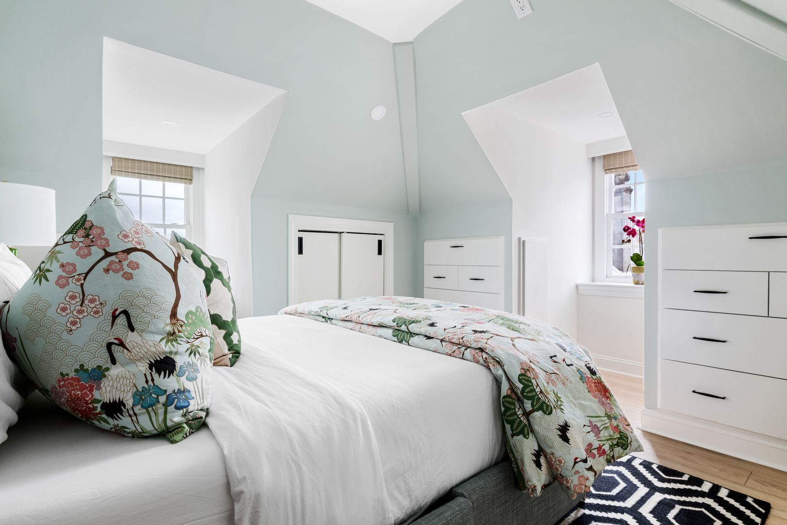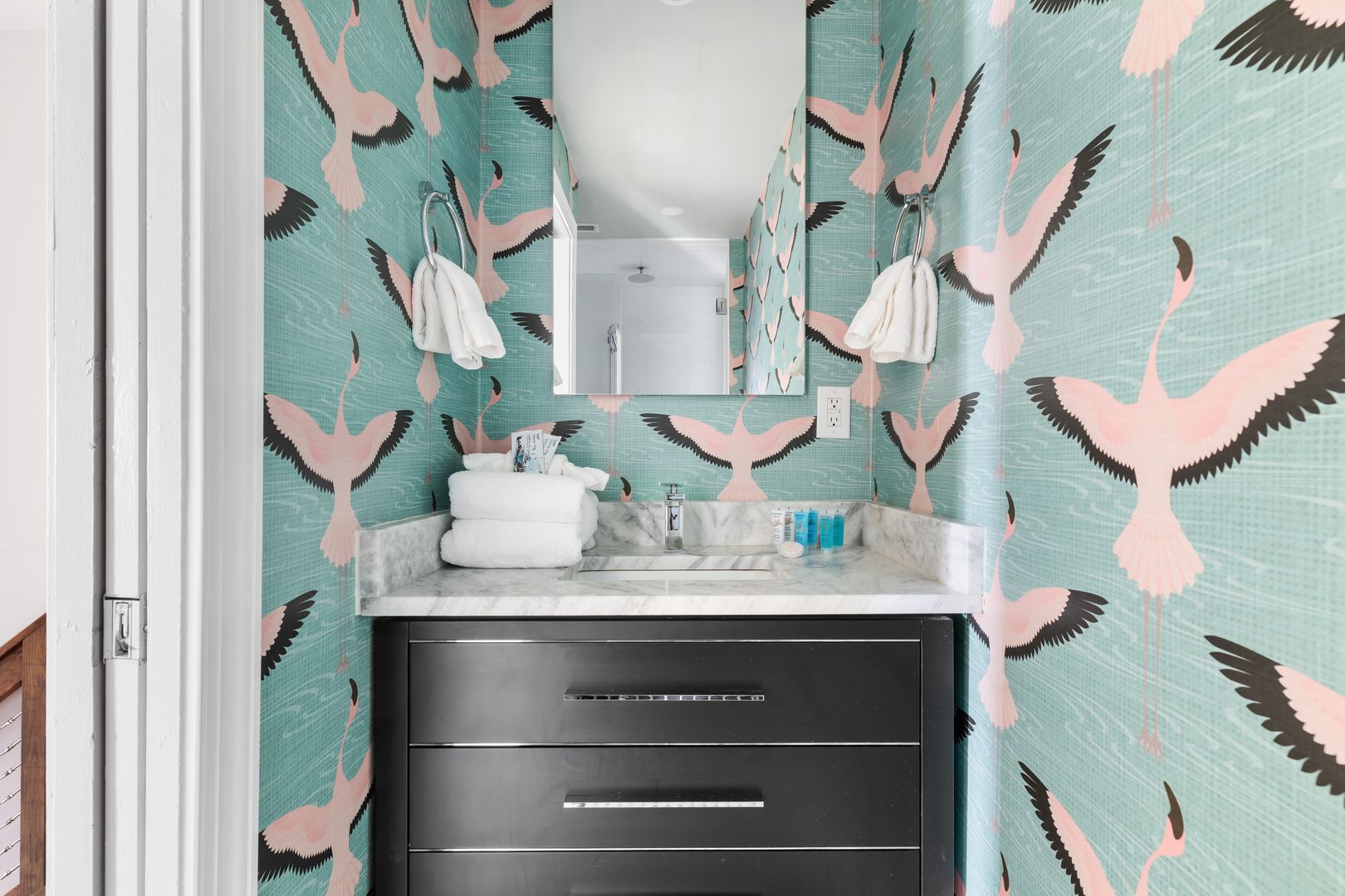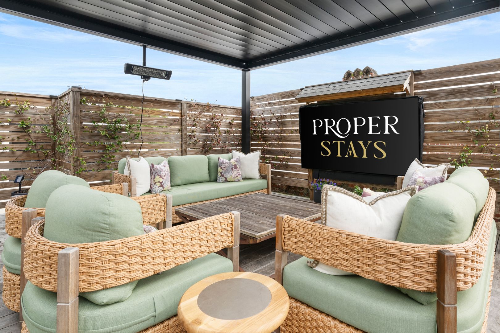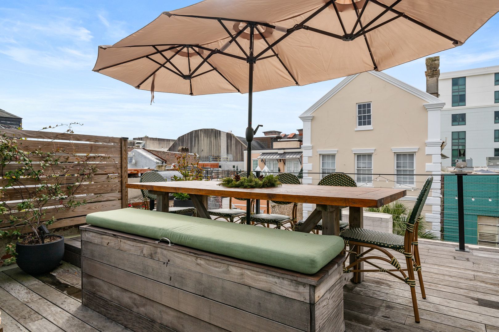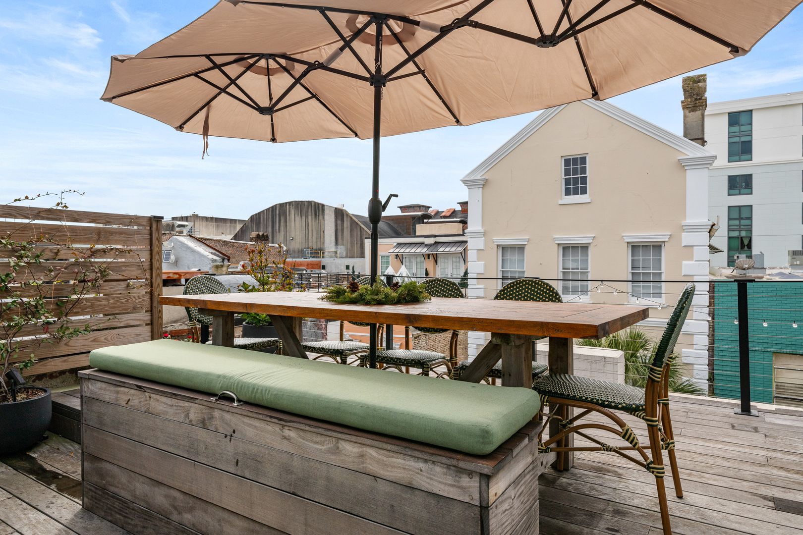 One of the standout features of The Skyline Suite is the spacious roof deck, accessible via a small door. This elevated retreat includes a comfortable seating arrangement, a TV, and a dining table for eight. With a panoramic view of King Street, it is an exceptional spot for both relaxation and entertaining.