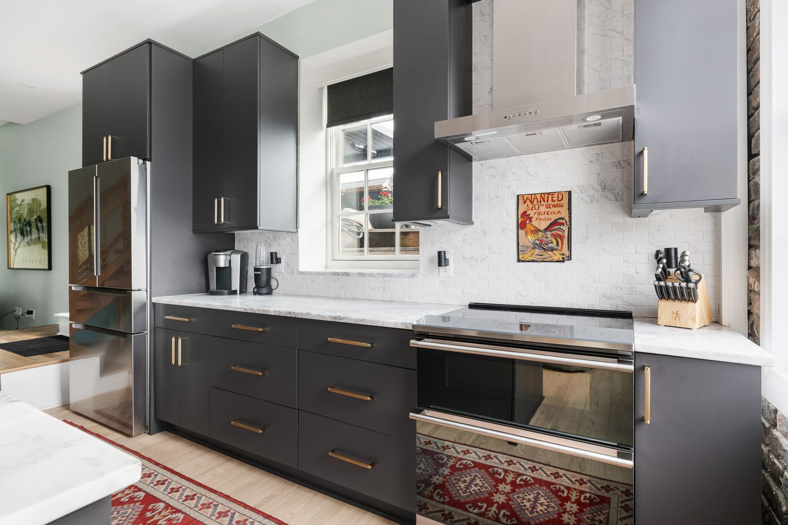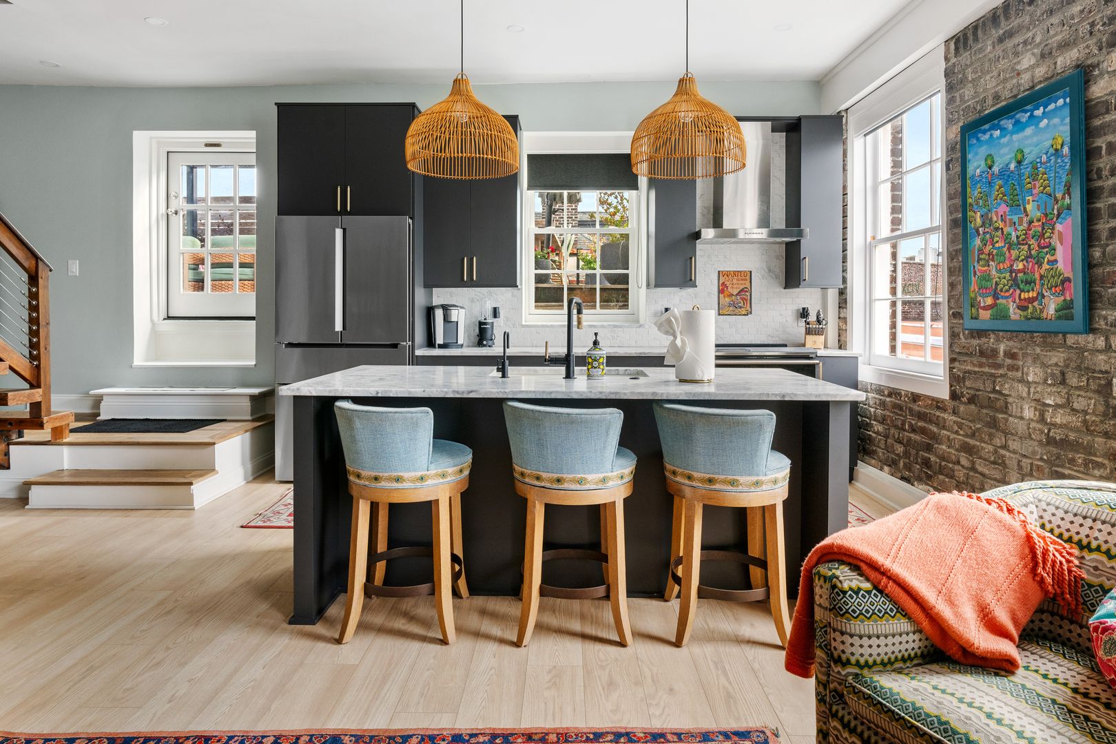 The modern kitchen is a highlight, boasting gorgeous countertops, ample cabinet space, and seating for three at the kitchen island. A conveniently located half bathroom on this level adds to the comfort and functionality of the space.