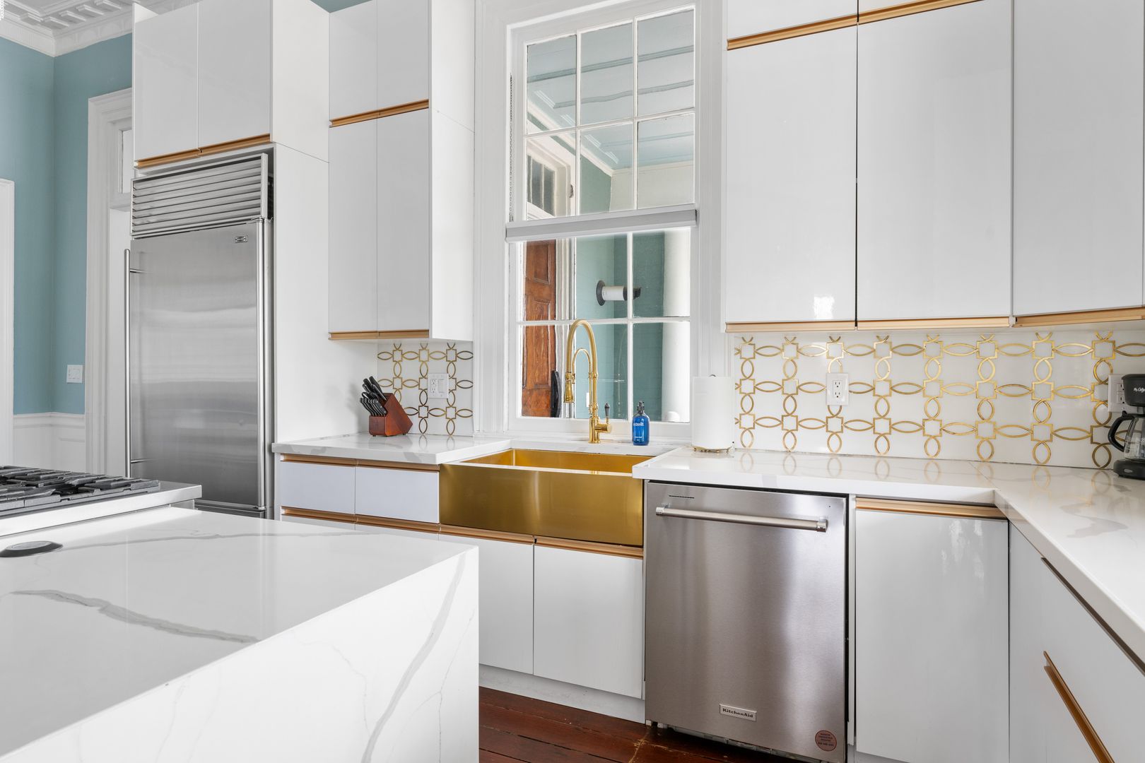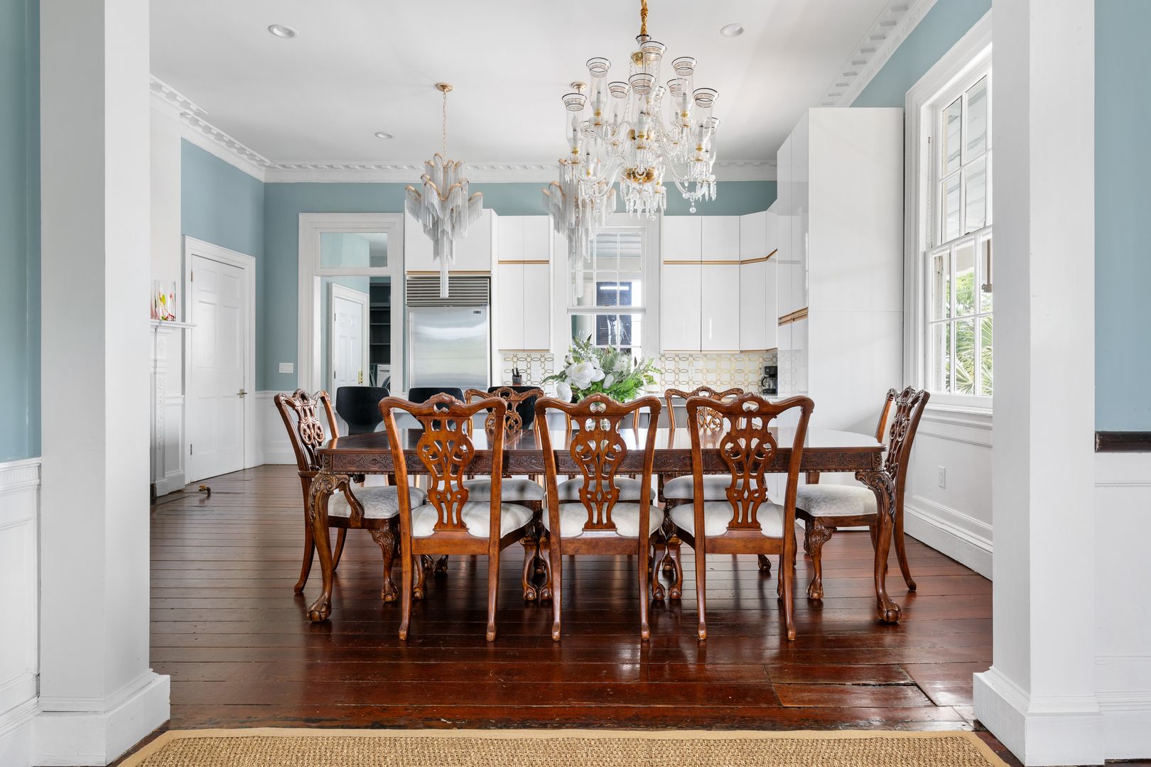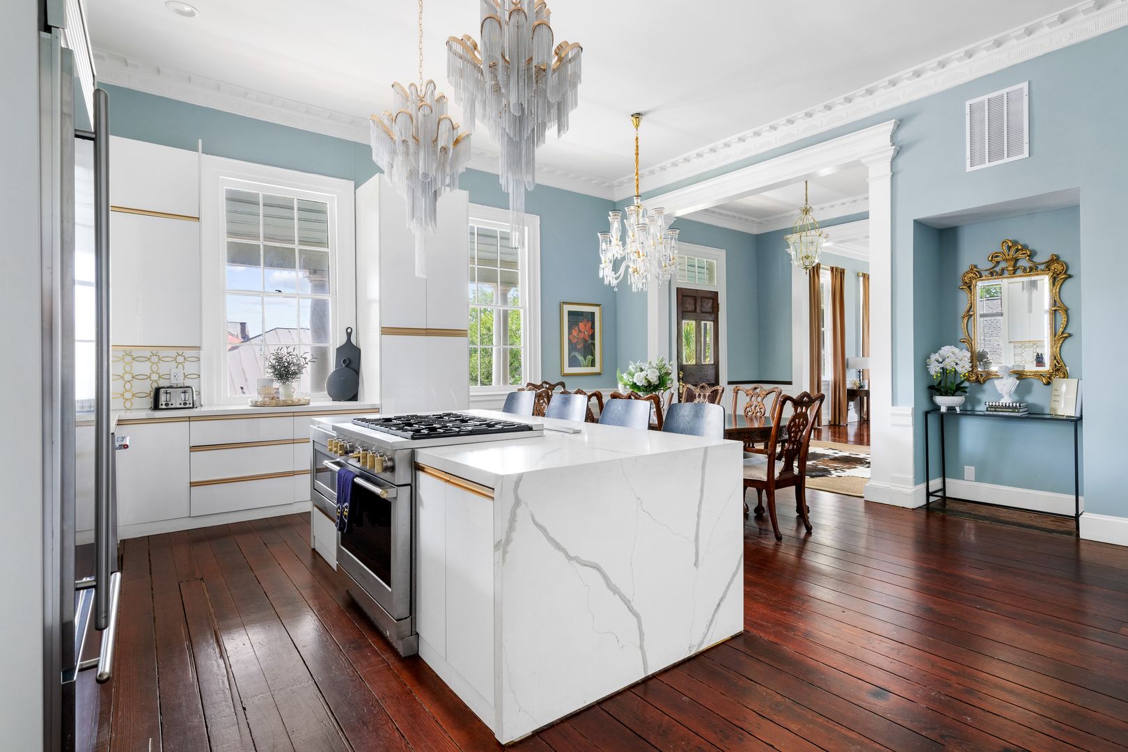 This spacious multi-level apartment features a relaxed, open layout with high ceilings and classic architectural details throughout. The living area includes a large sectional sofa and flows easily into a well-appointed kitchen with stainless steel appliances, a central island with seating for four, and an adjacent dining space perfect for casual meals or entertaining.