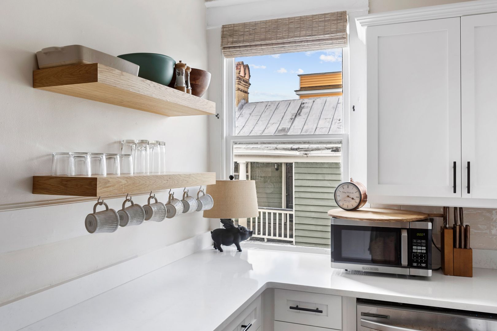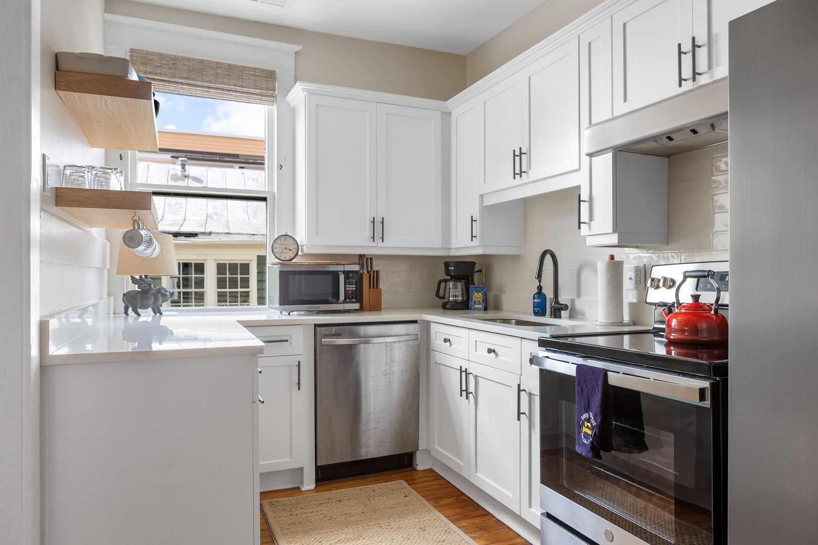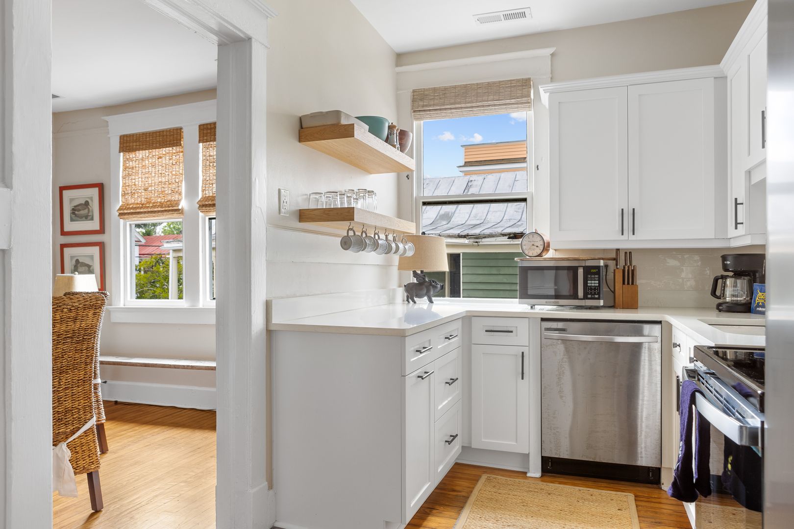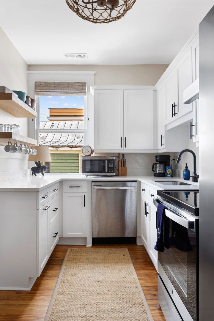 Adjacent to the living room, the porch provides a cozy seating arrangement where you can unwind and enjoy the fresh air. Please note that this porch is a shared space with the neighboring apartment on the same floor. The recently updated kitchen boasts stainless steel appliances, ample cabinet space, and comes fully stocked with all the cooking essentials you might need.
