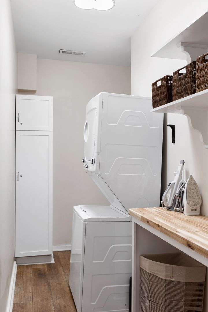 At the back of the home, you will find additional storage space, which also houses a washer and dryer. This area serves as a throughway to the back door, providing easy access to the parking area where a spot for one car is available in the driveway.