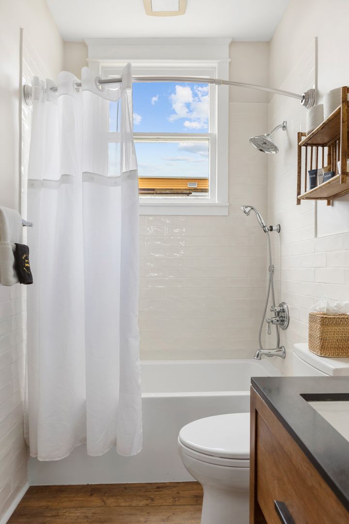 The bedroom is a serene retreat featuring a king-size bed and plenty of windows that allow natural light to flood the room. There is ample storage with a dresser and closet to keep your belongings organized. The bathroom includes a vanity and a tub/shower combo for your convenience.