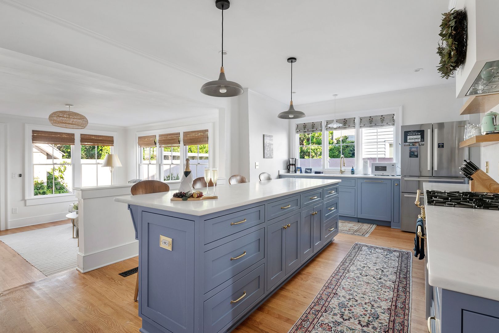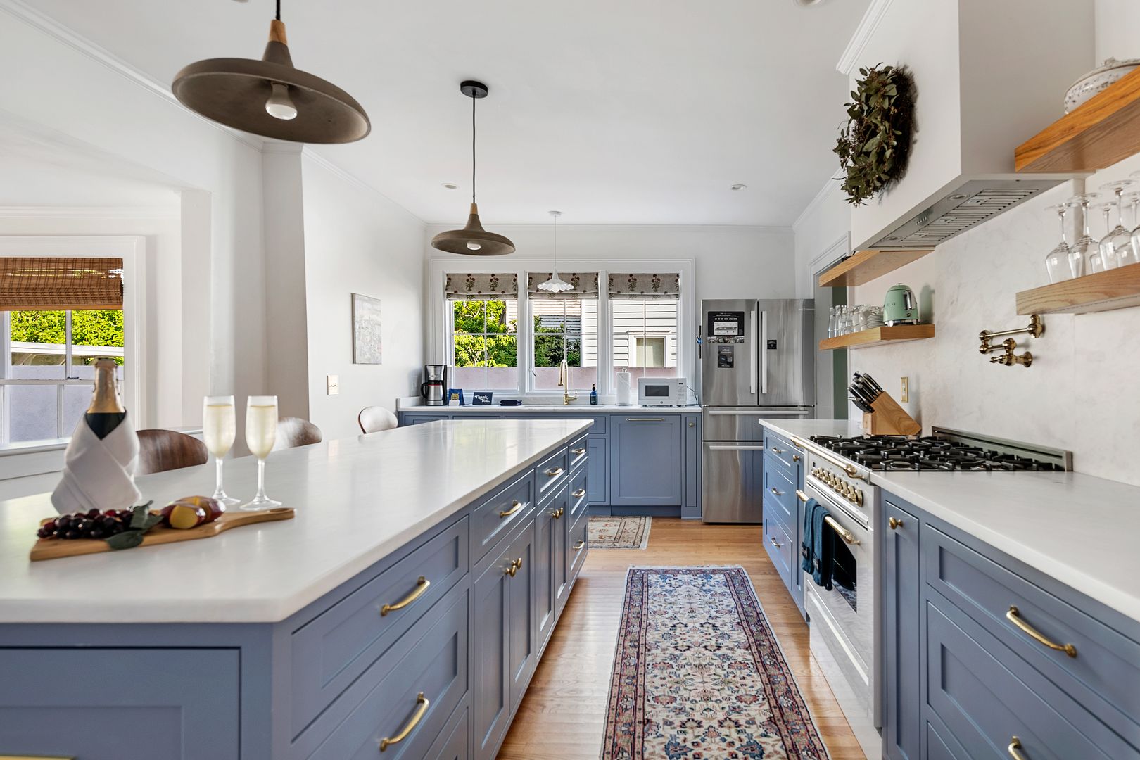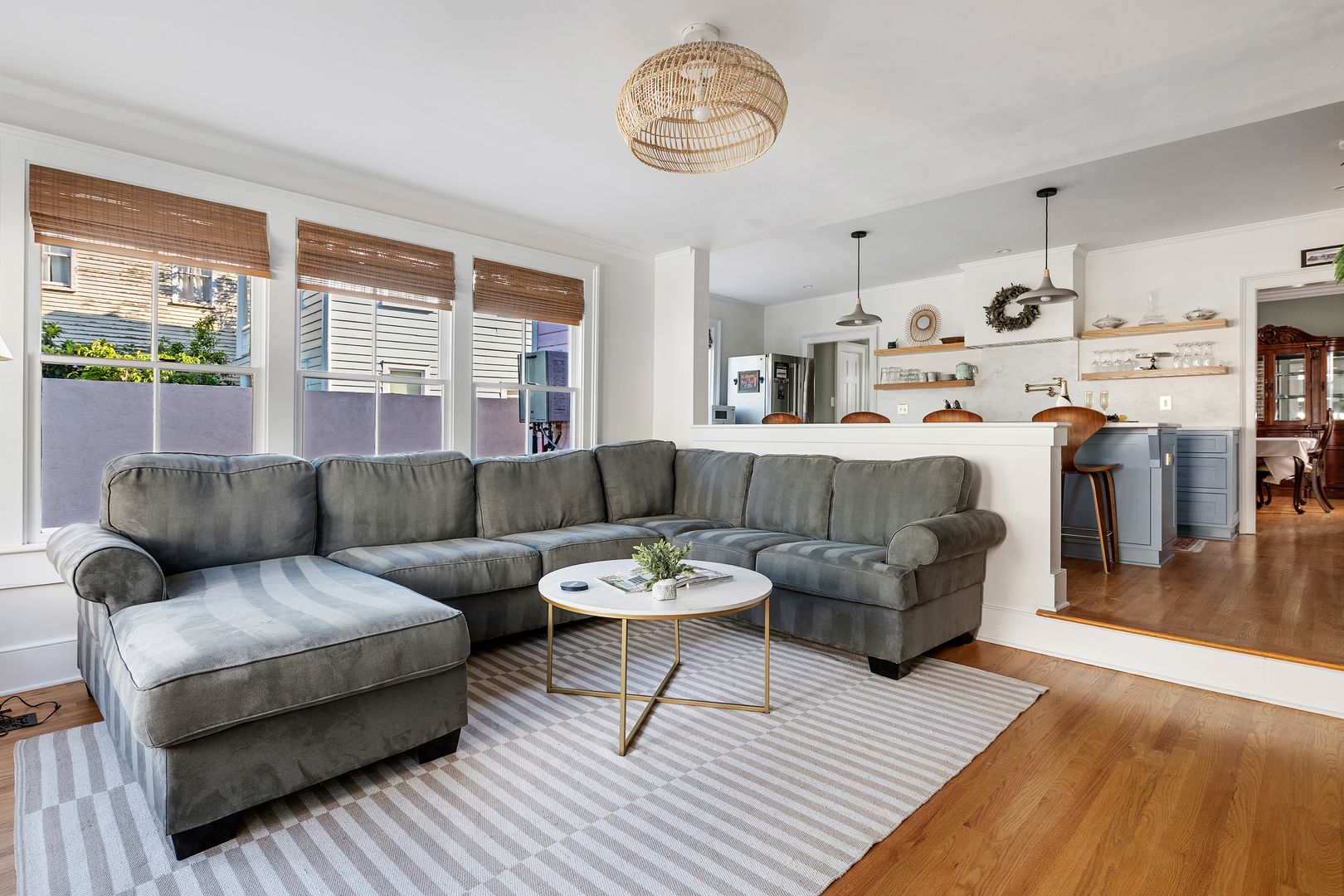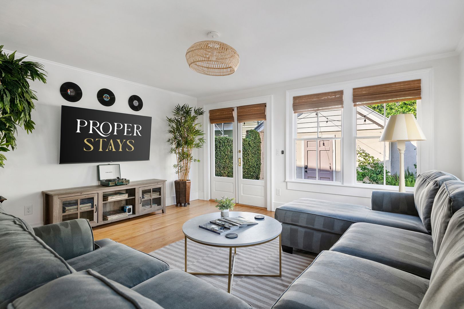 Continue through to the expansive, renovated kitchen and living room. The kitchen is a chef’s dream with a generous island that seats four, ample countertop and cabinet space, and high-end stainless steel appliances including a gas range. Large windows fill the living room with natural light, and the oversized sectional offers a comfortable spot to unwind and watch TV. A convenient half bathroom is also located on this level. Step out the back door to enjoy the private patio and yard—a rare find in the city.