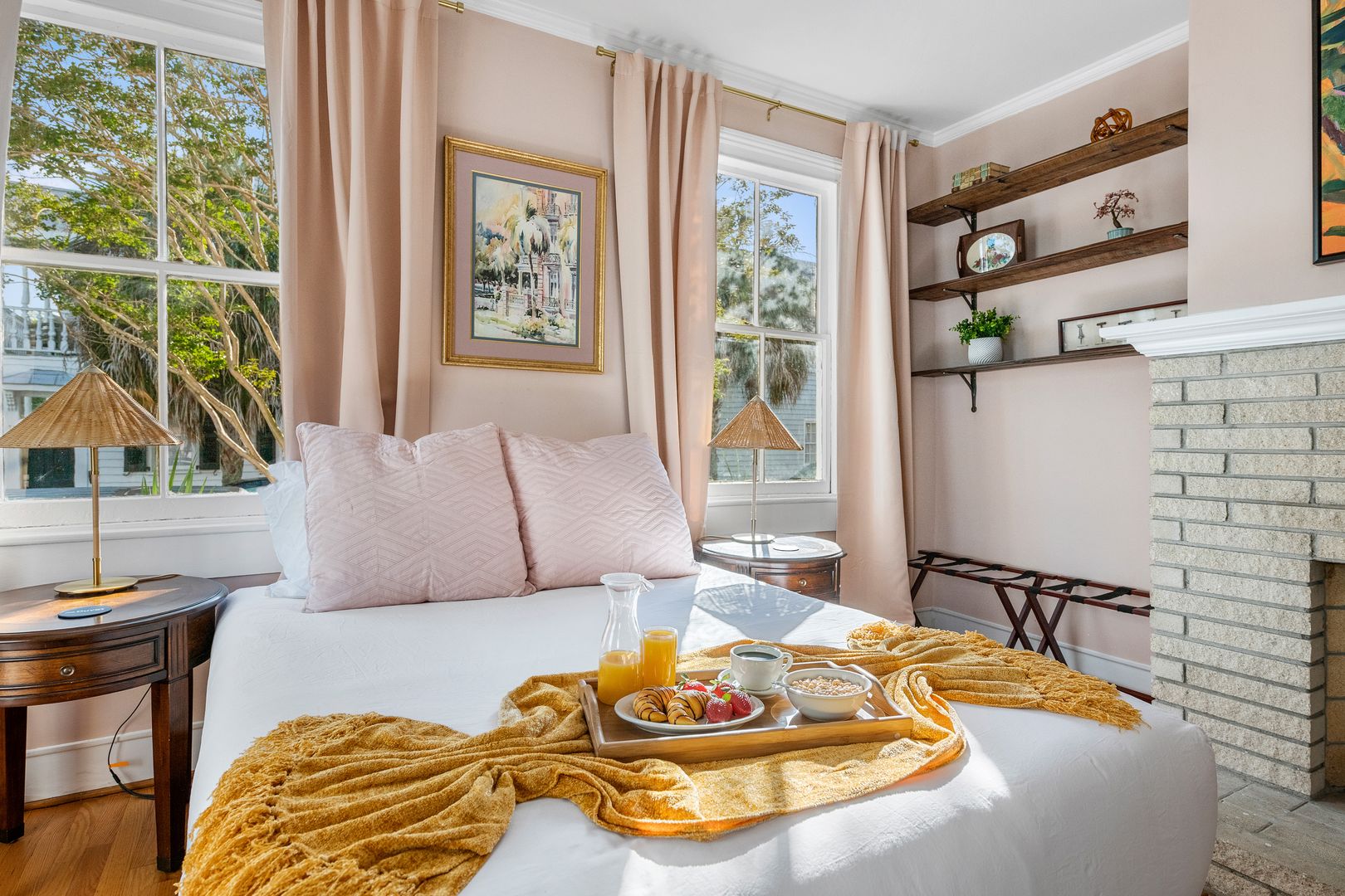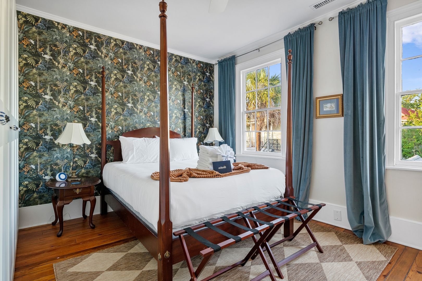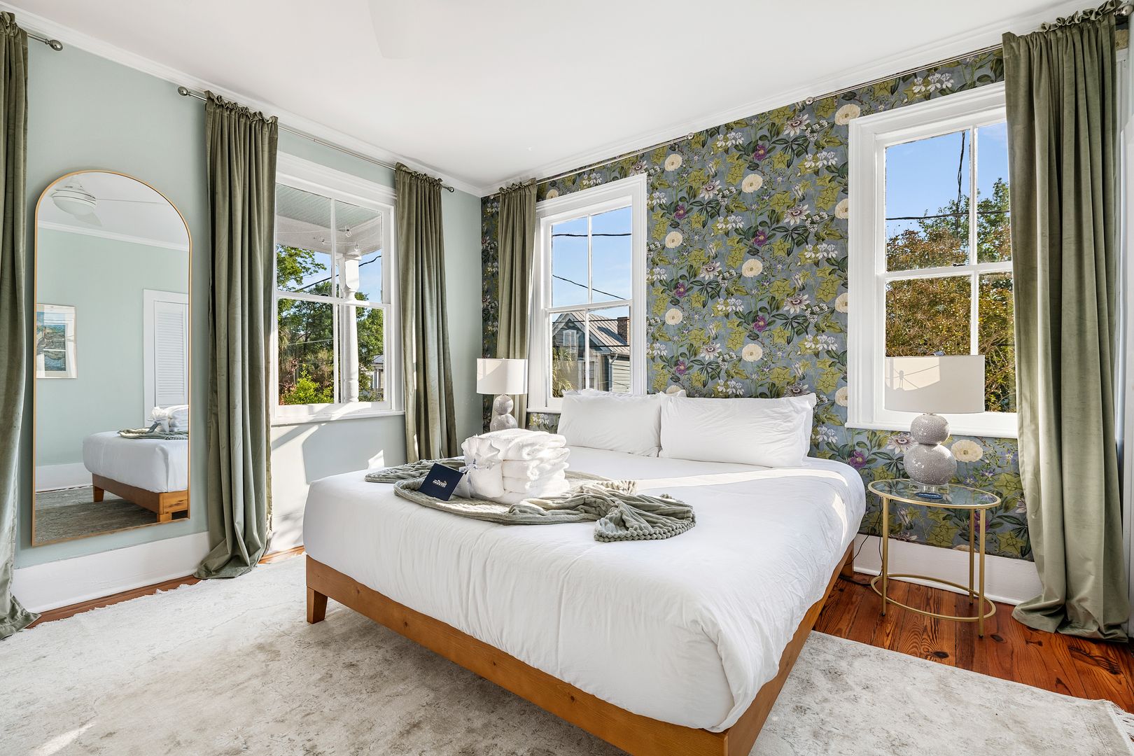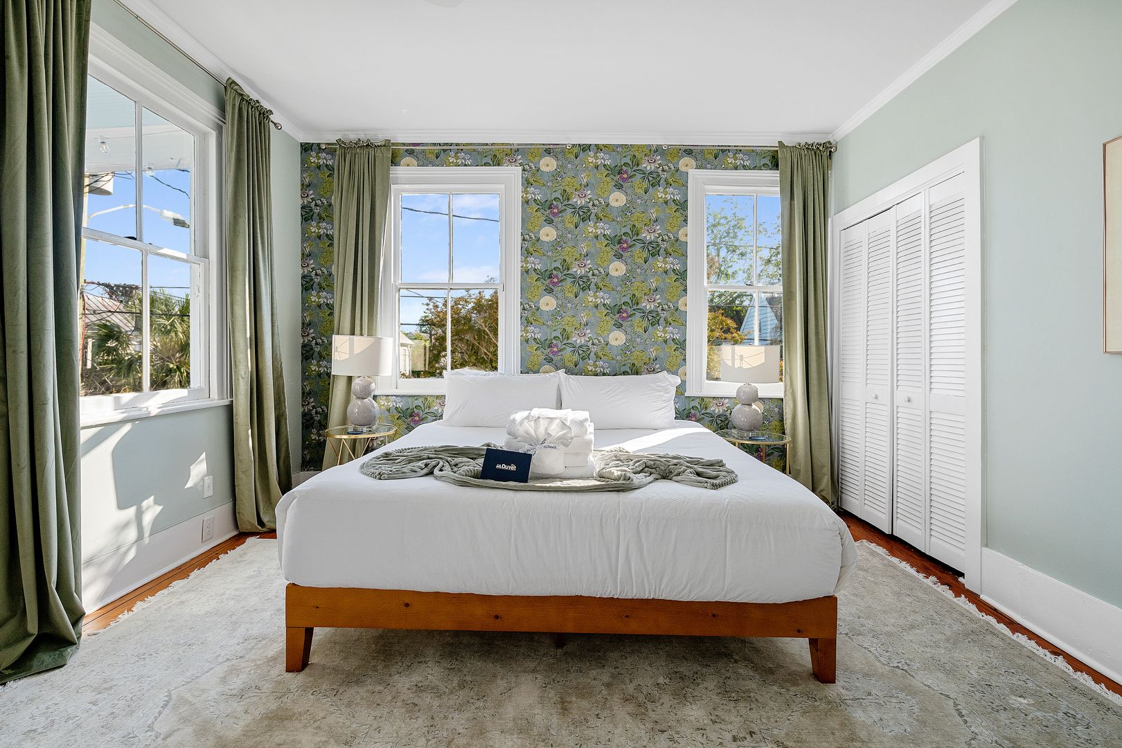 Welcome to The Pink Palm, a spacious and stylish single-family home nestled in the heart of Downtown Charleston. This fully furnished 30+ day rental artfully combines timeless details with elevated, everyday livability, offering four bedrooms and two and a half bathrooms. Step through the front door into a welcoming foyer. To your left, you'll find a cozy bedroom with a queen-size bed, decorative fireplace, closet, and small desk—ideal for working from home. To the right is the formal dining room featuring a large table, perfect for entertaining or hosting dinners.