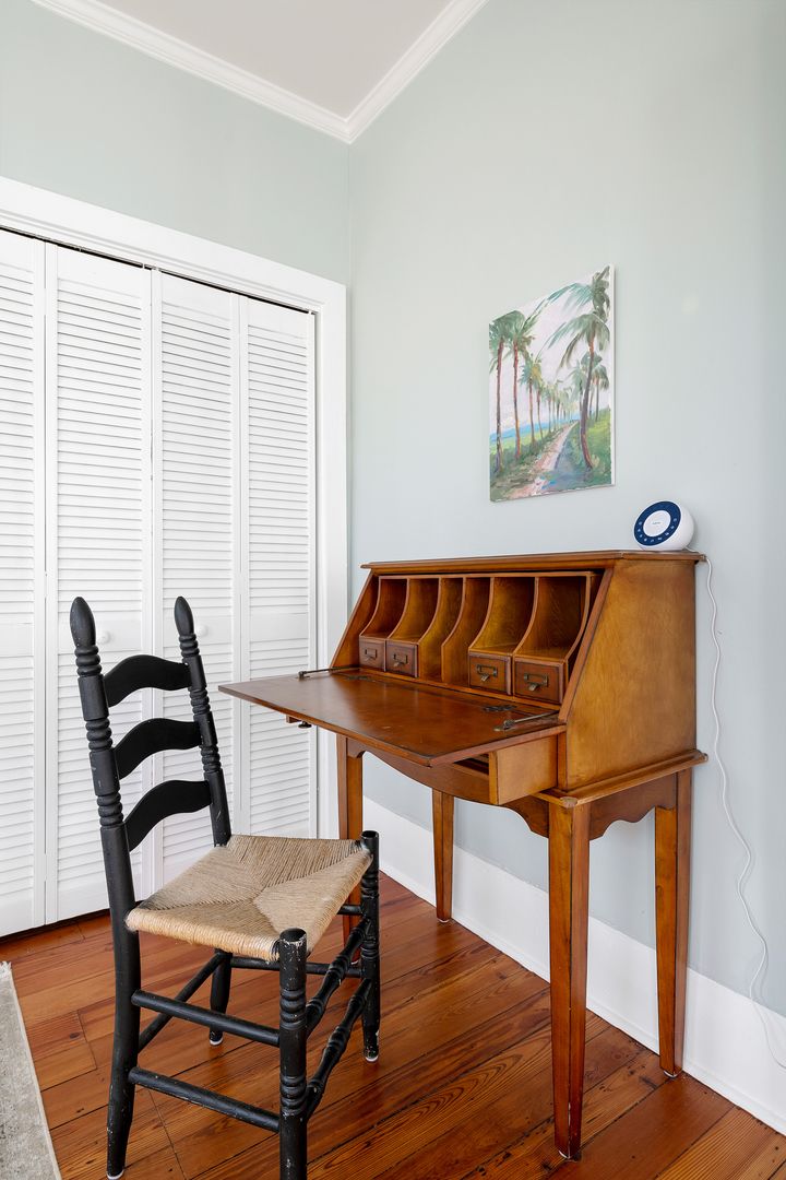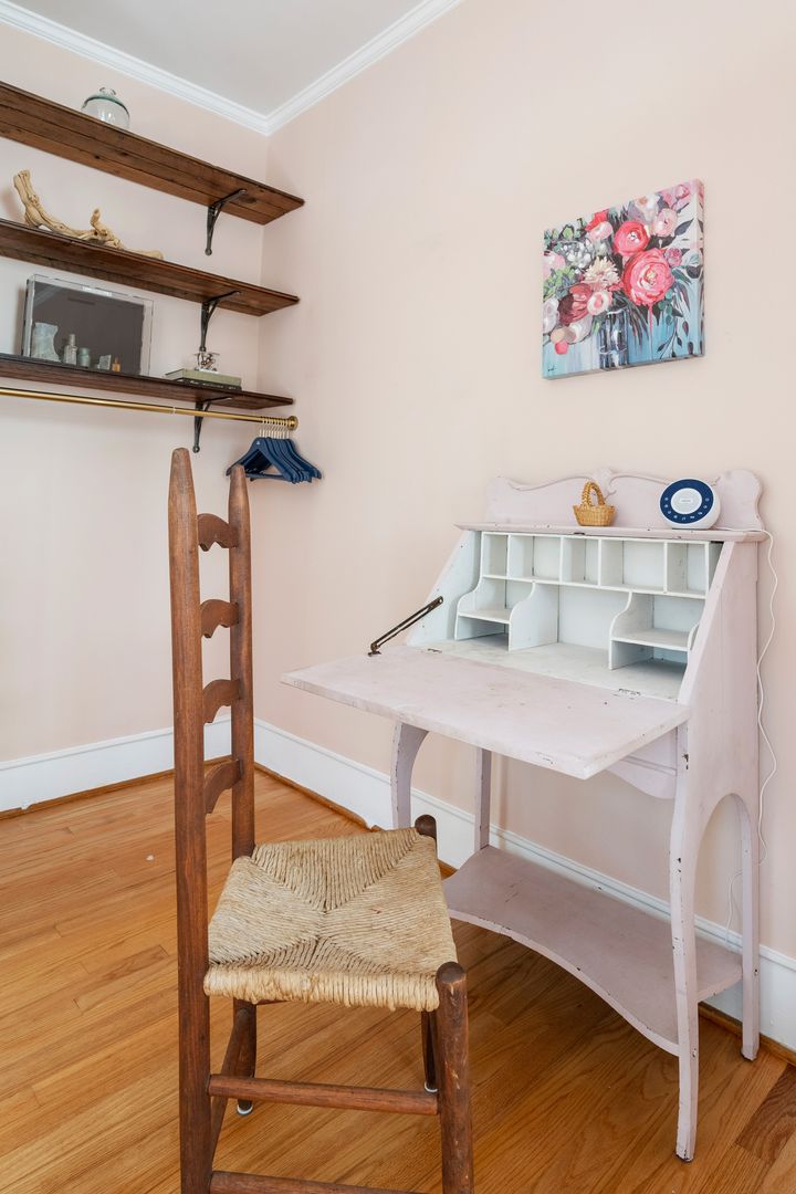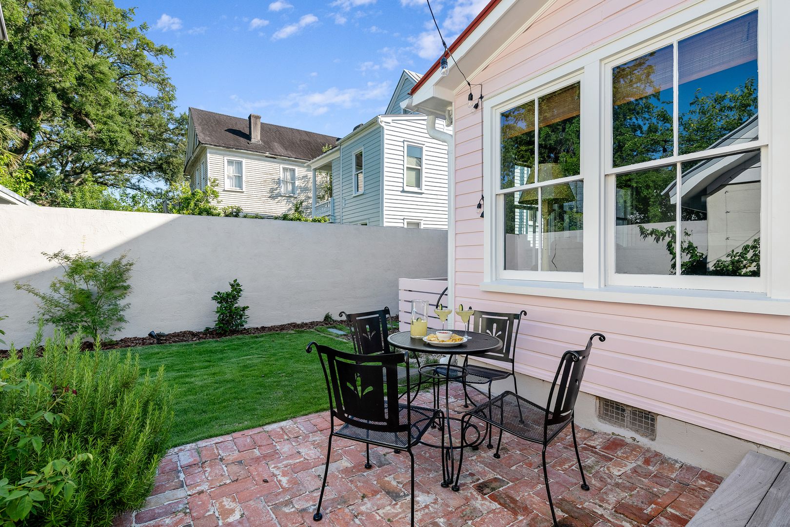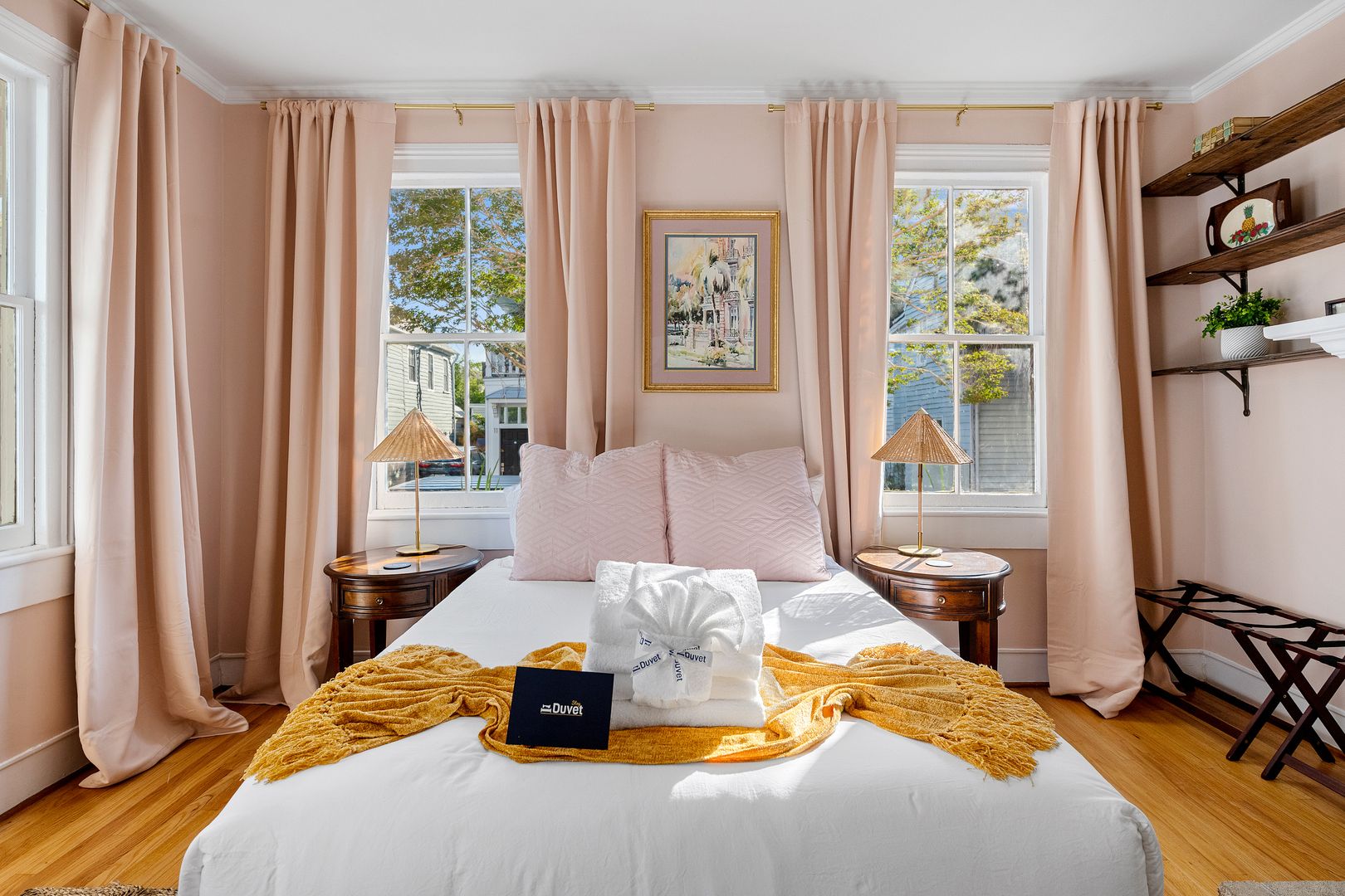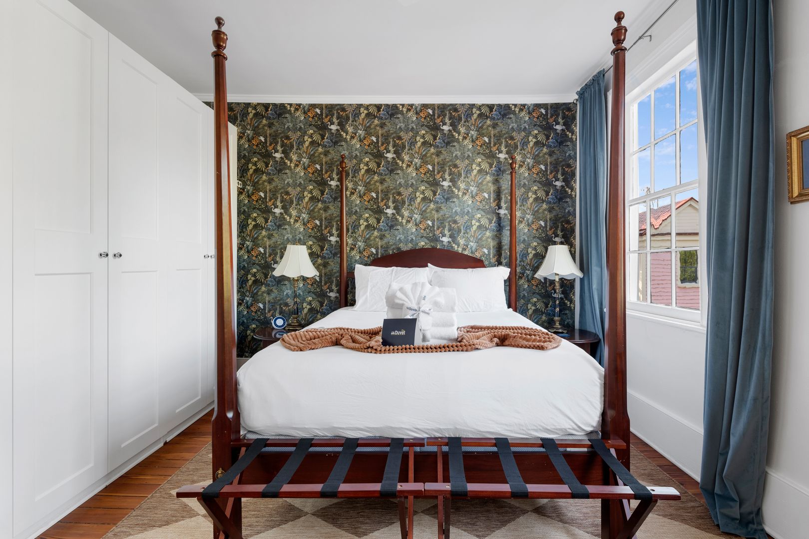 Welcome to The Pink Palm, a spacious and stylish single-family home nestled in the heart of Downtown Charleston. This fully furnished 30+ day rental artfully combines timeless details with elevated, everyday livability, offering four bedrooms and two and a half bathrooms. Step through the front door into a welcoming foyer. To your left, you'll find a cozy bedroom with a queen-size bed, decorative fireplace, closet, and small desk—ideal for working from home. To the right is the formal dining room featuring a large table, perfect for entertaining or hosting dinners.