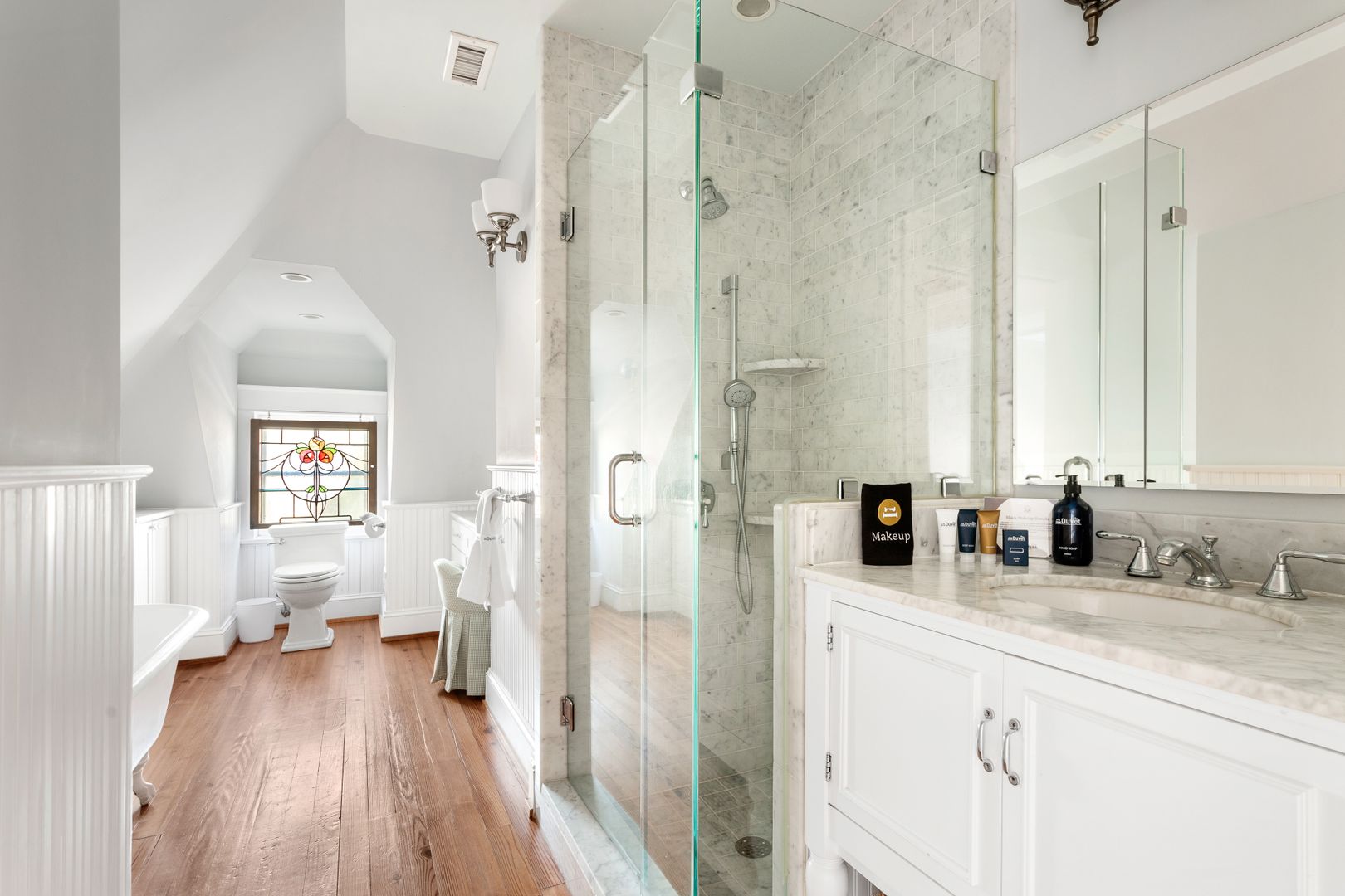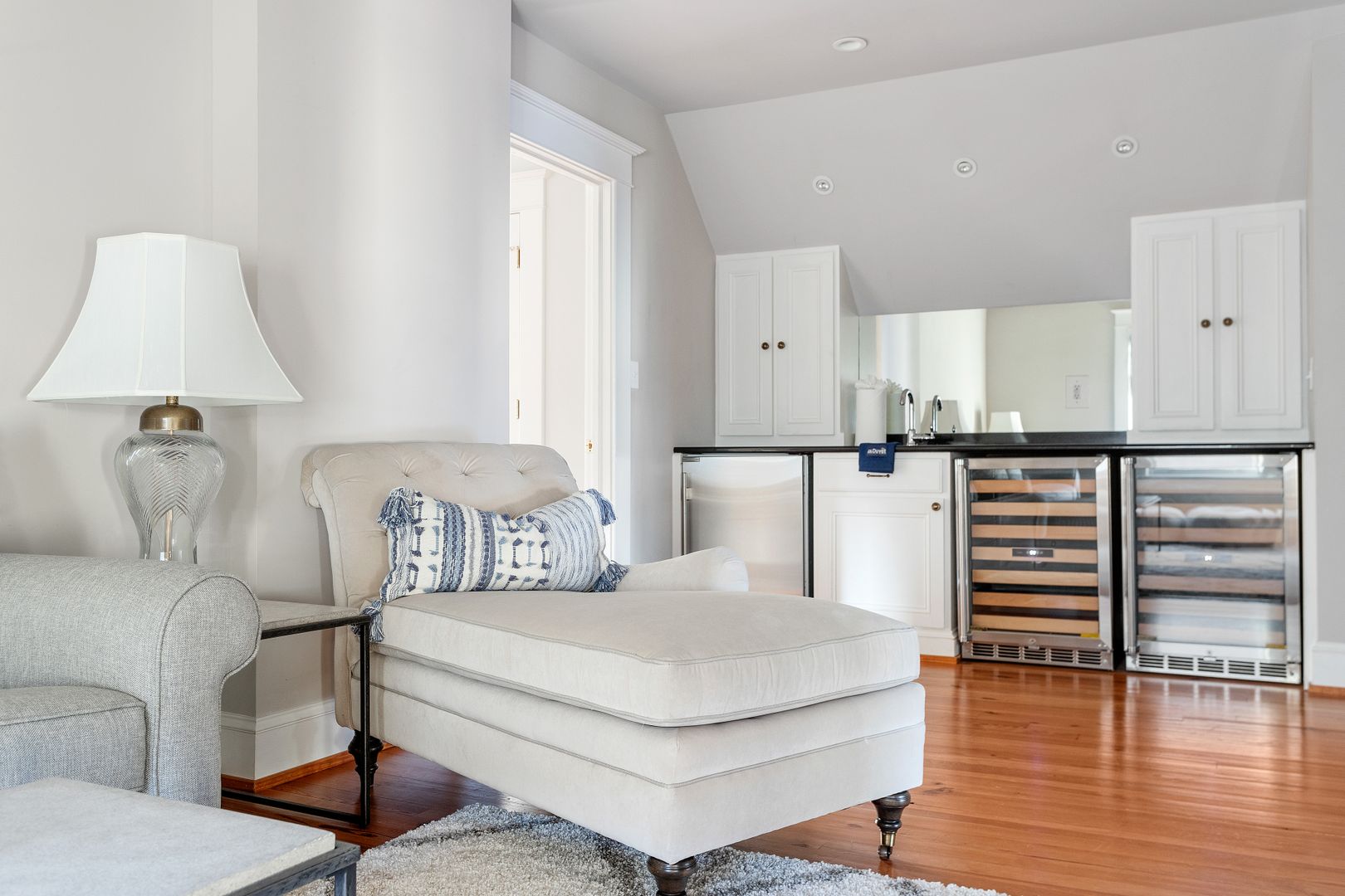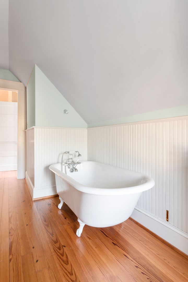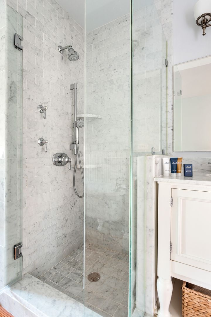 The third floor is the perfect bonus space! You will find another living room with comfortable couch, chaise lounge, and Smart TV, a kitchenette with a Subzero beverage fridge, two wine fridges and a bar sink. The bedroom on this level features two twin beds and a large closet. The adorable full size bathroom has a claw foot tub, standalone Carrera marble shower with Grohe shower head, Carrera marble sink and dressing vanity. The other room on this level has been turned into a home office, perfect for all of your work from home needs!