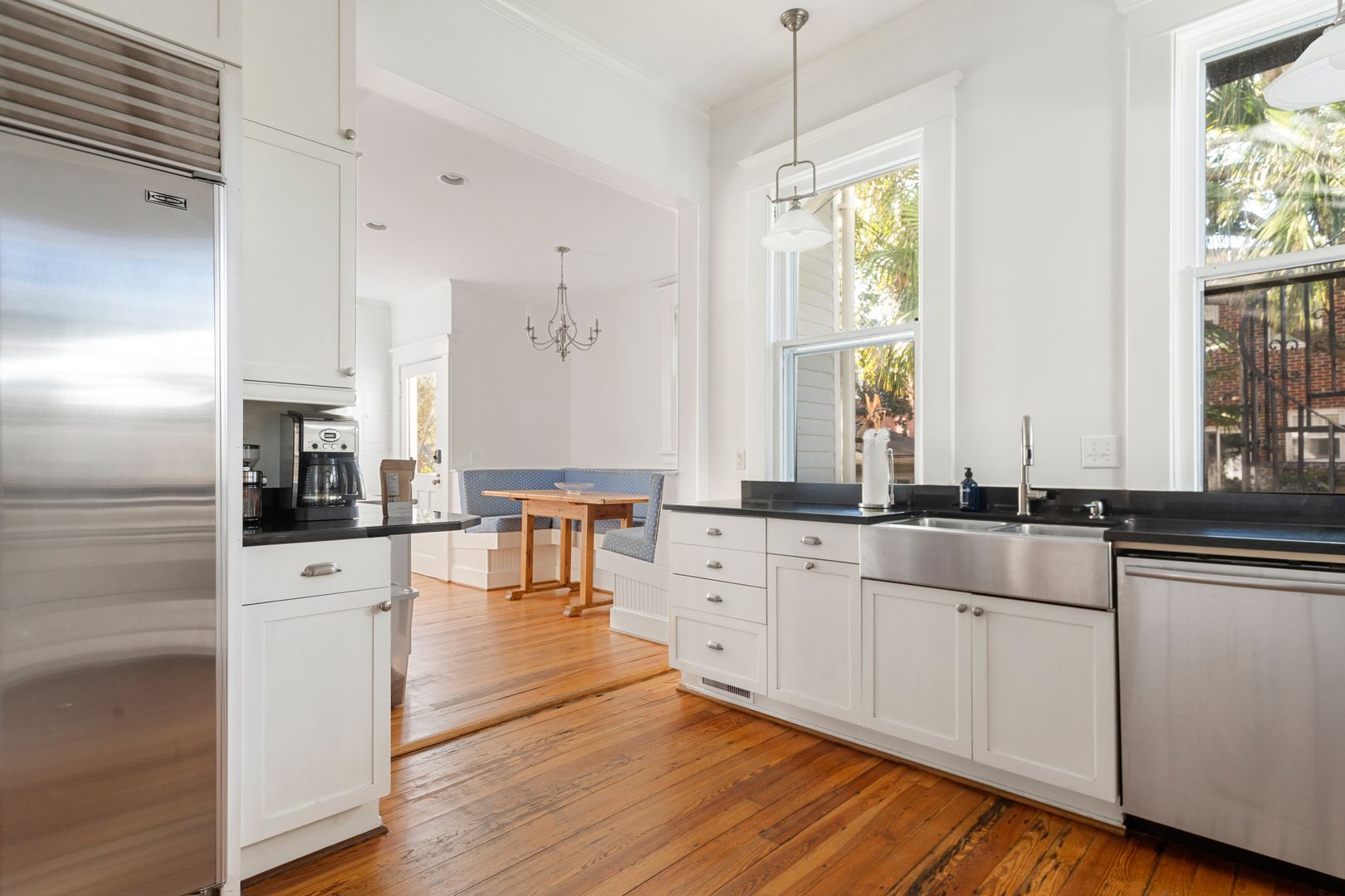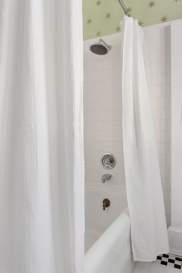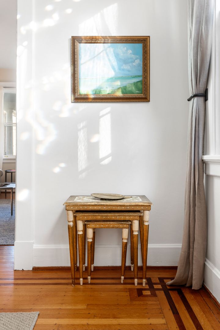 The first floor features the living room, dining room, kitchen, and a half bath. The living room is perfect for entertaining or watching the Smart TV. It features a working gas fire place and a chandelier that is original to the house. The dining room has a large dining table with seating for six, and is separated by a pocket door from the living room. The fully remodeled kitchen features an eat-in nook and top of the line appliances (Wolf 6 Burner stove, Subzero Fridge & Freezer, Bosch Dishwasher and Subzero beverage fridge). The powder room half bath is also located on the main floor.