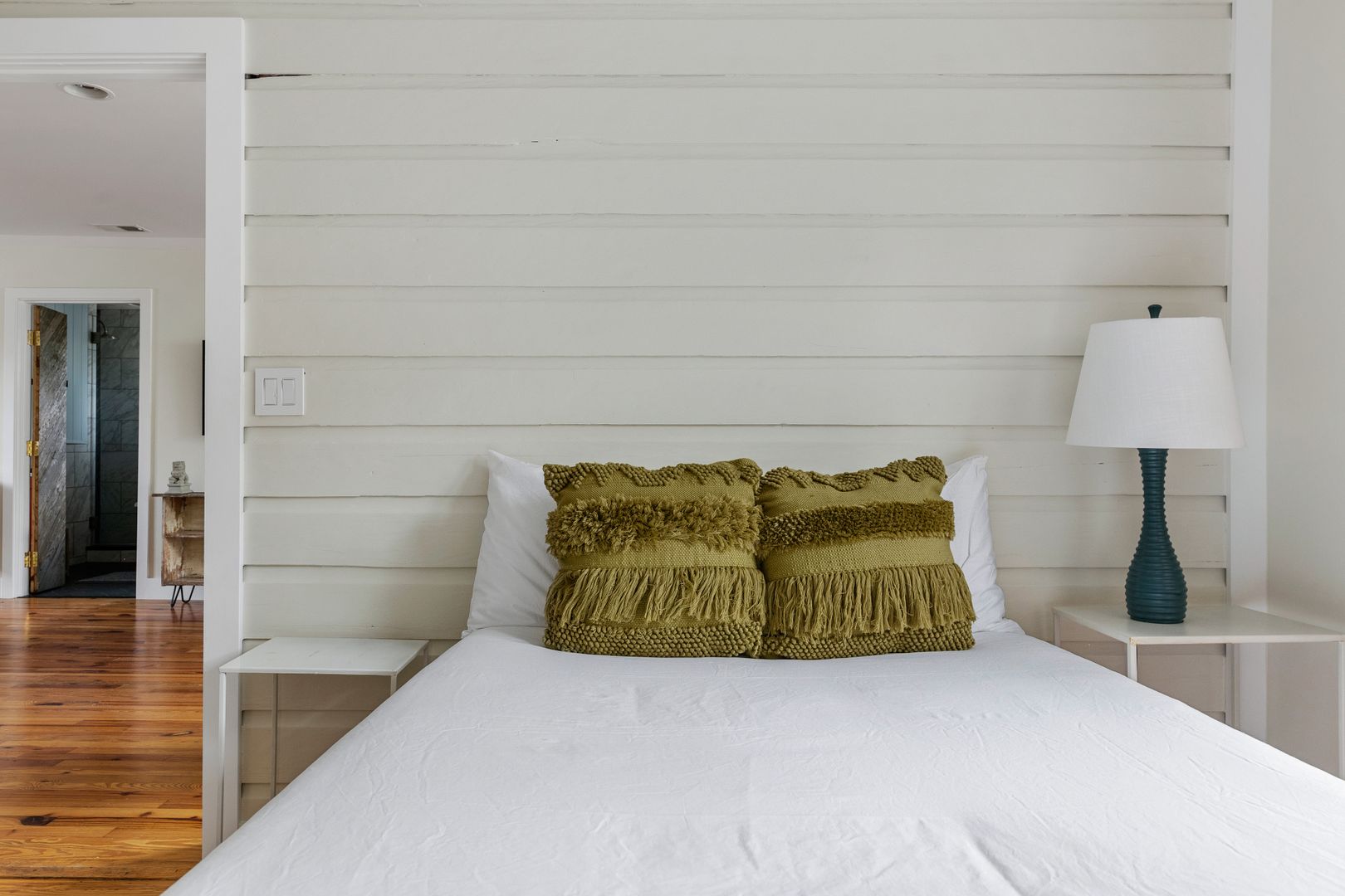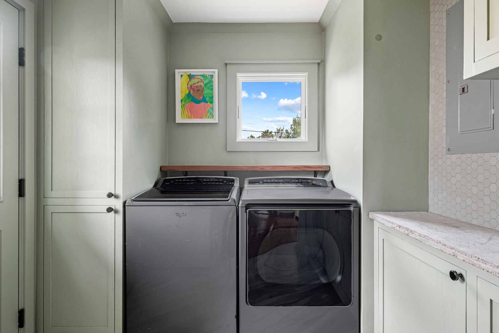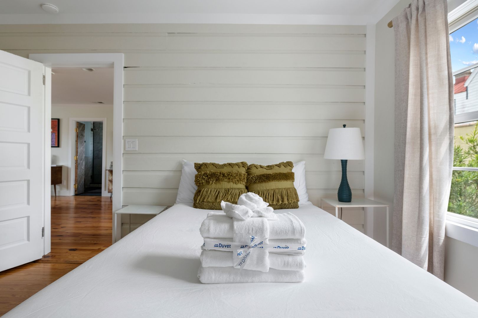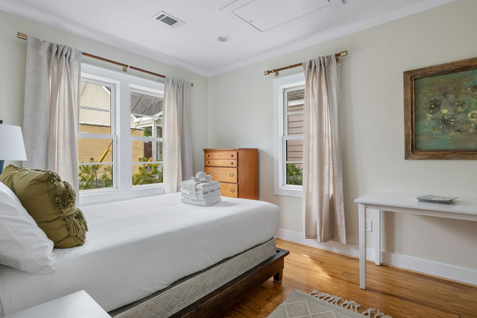 Both of the bedrooms are spacious and comfortable with plenty of natural light. The first of the two bedrooms features a queen size bed, dresser, and smart TV. The other bedroom features a full size bed, dresser, and a desk for all of your work from home needs! There is a beautiful bathroom that both of these bedrooms will share which features a large soaking tub, tile shower, and vanity. The large laundry room is just off of the kitchen and features a full size washer/dryer and cabinet space for additional storage!