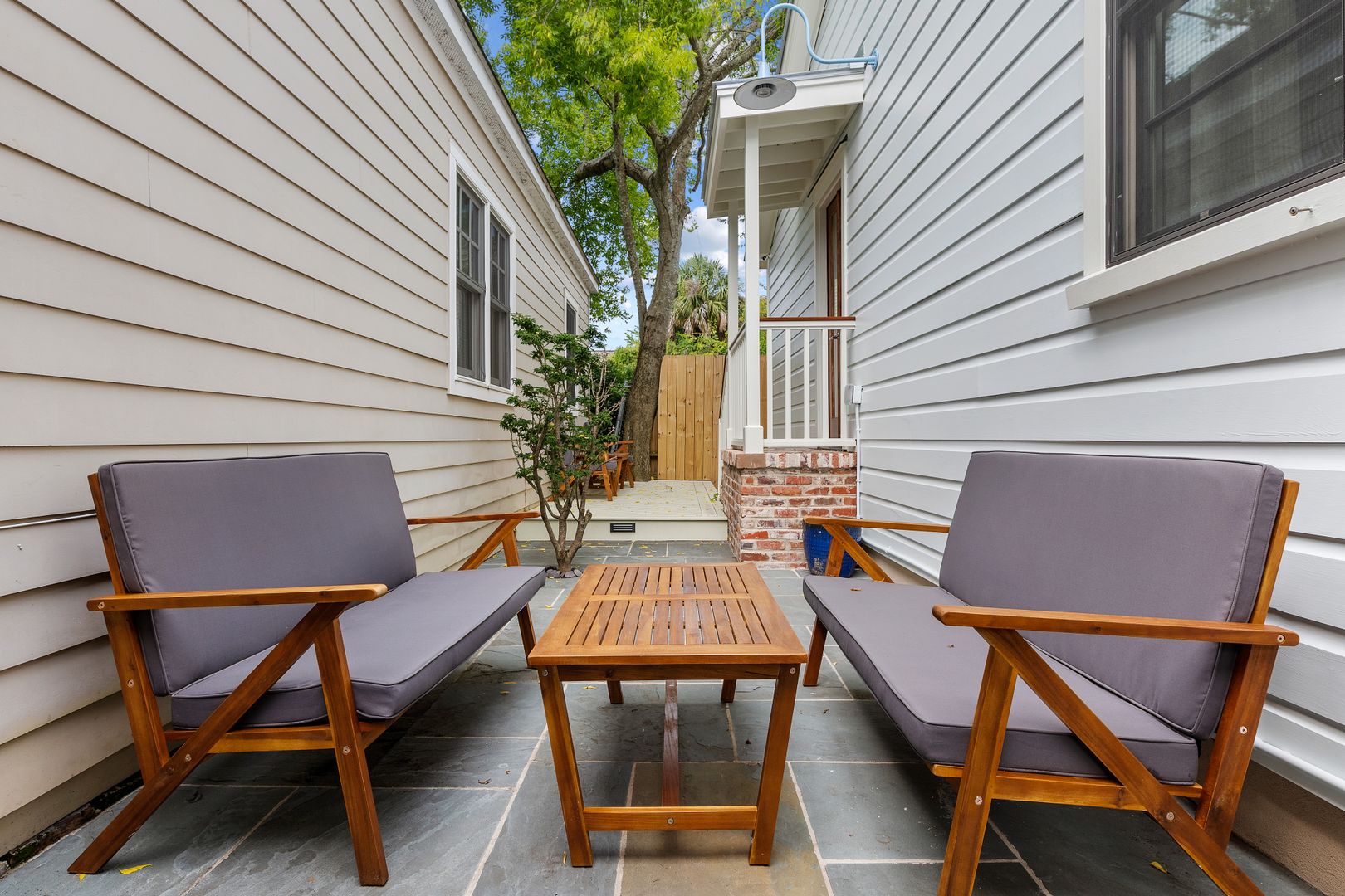 Bring your Charleston living outside with the private outdoor patio. Here you will find two comfortable seating areas, perfect for relaxing and enjoying the beautiful Charleston weather! There is also an outdoor shower, great for rinsing off after a day at the beach!