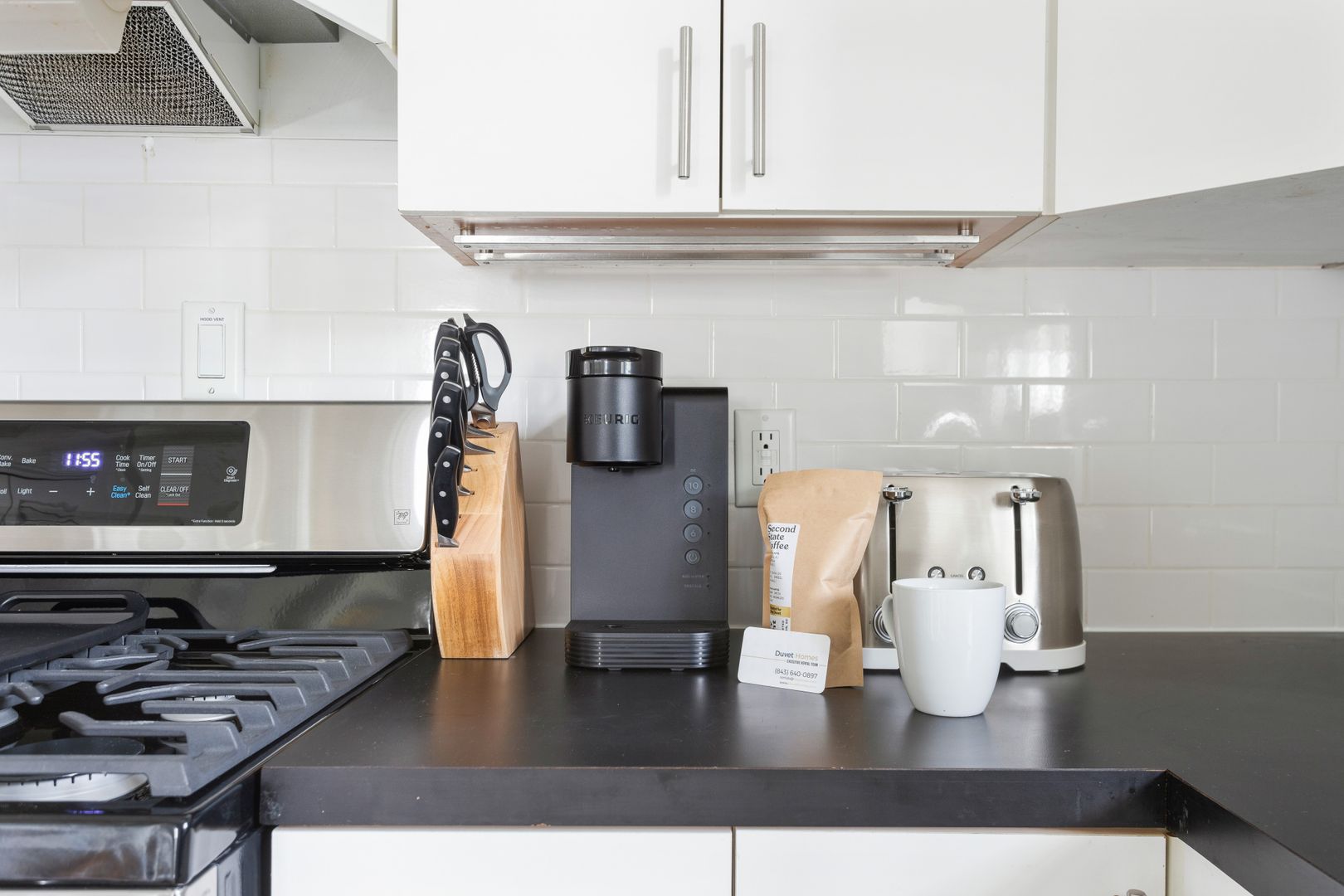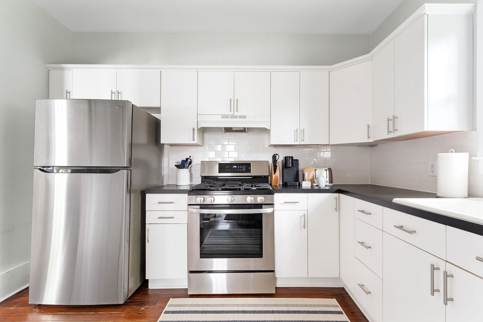 The living room features a sectional sofa, chair, and a large smart TV, perfect for relaxing and watching a movie! Off the living room you will find the kitchen which features stainless steel appliances, white cabinets, and a Keurig coffee machine. There is an adorable breakfast nook connected to the kitchen which features seating for 5! There also is a full bathroom on this level. At the front of the house on the first floor is a large room that can double as a home office or another bedroom with a trundle that has two twin beds.