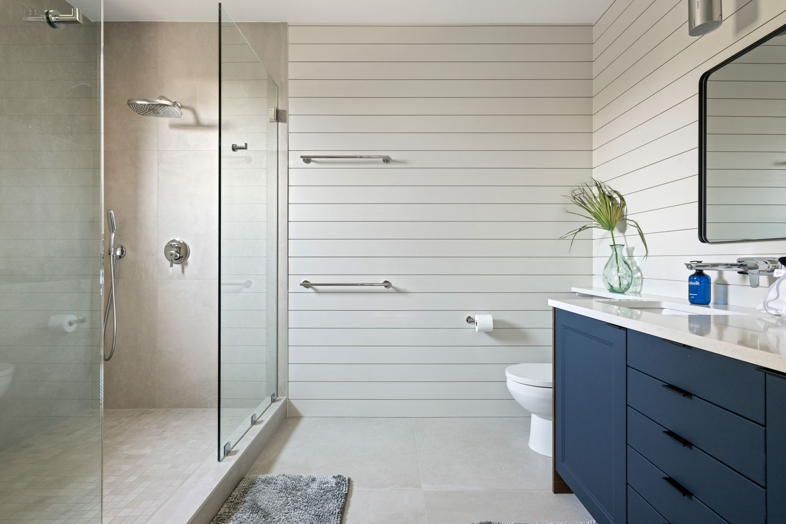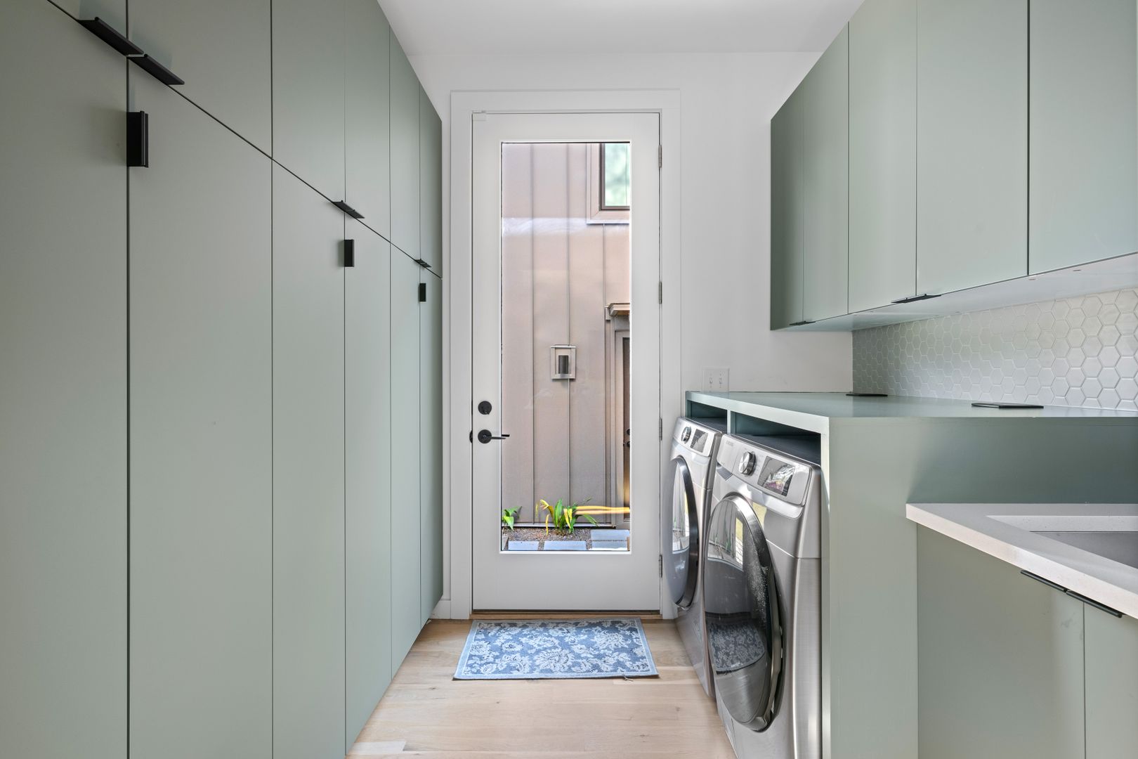 The first floor also hosts a serene bedroom with a queen size bed, TV, and ensuite bathroom featuring a luxurious walk-in shower. A convenient half bathroom and a well-appointed laundry room complete this level.