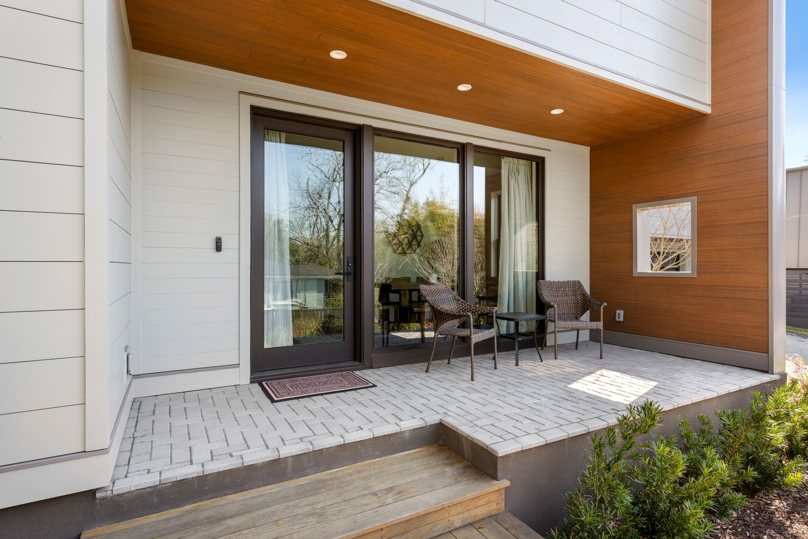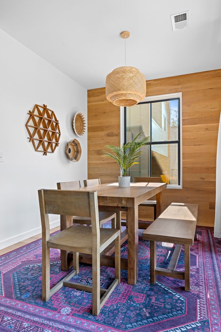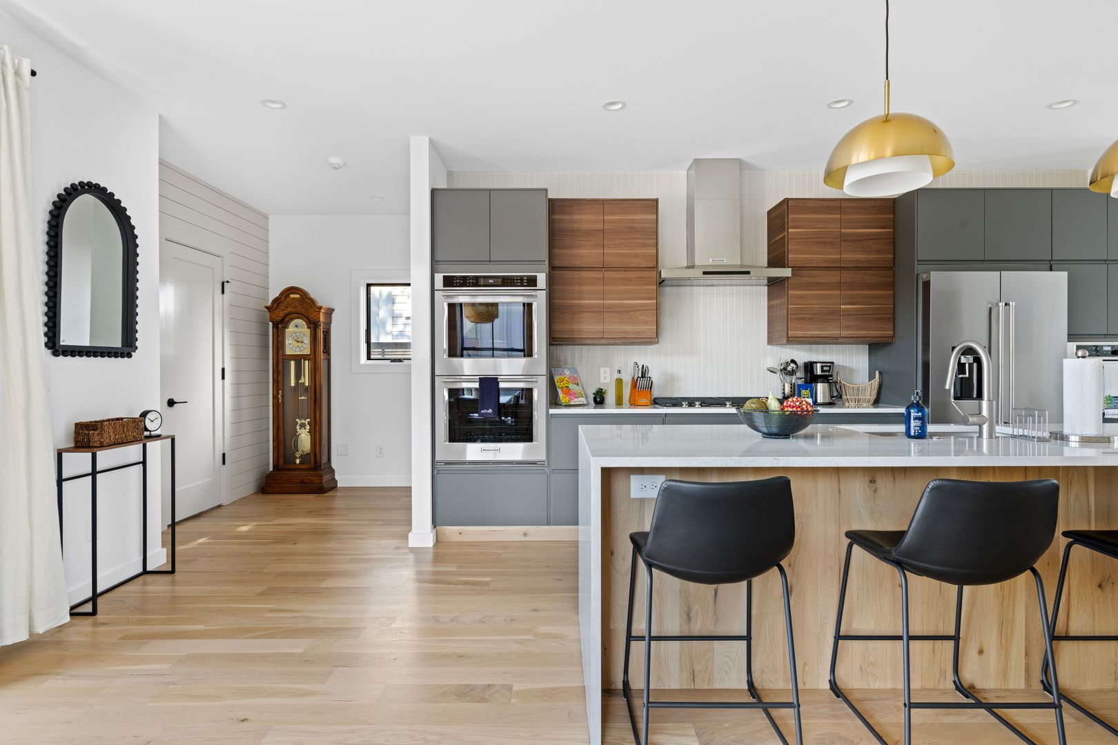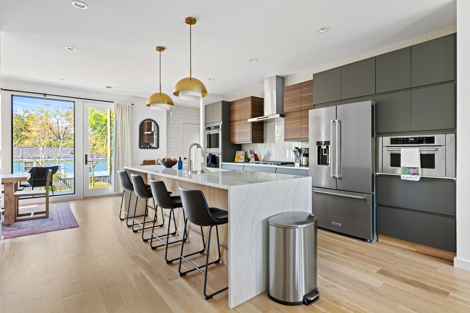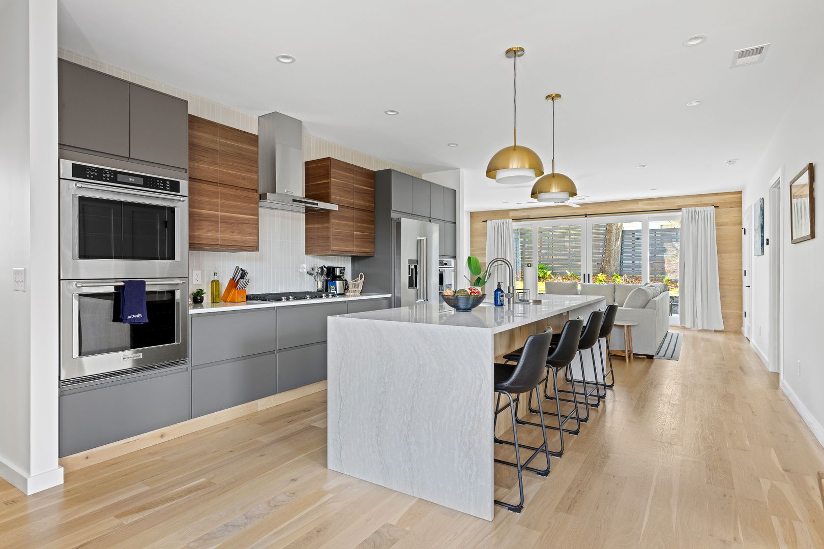 Step into the bright and airy open floor plan of the first floor, where every inch exudes modern elegance. The fully equipped kitchen boasts stainless steel appliances, ample cabinet space, and a generous island with seating for four, ideal for casual dining or entertaining. The adjacent dining area features a large table accommodating up to six guests, while the spacious living room invites relaxation with its plush sectional sofa and Smart TV. Sliding doors seamlessly connect the indoor and outdoor spaces, leading to your private backyard oasis. Enjoy al fresco dining on the patio equipped with a firepit and grill.