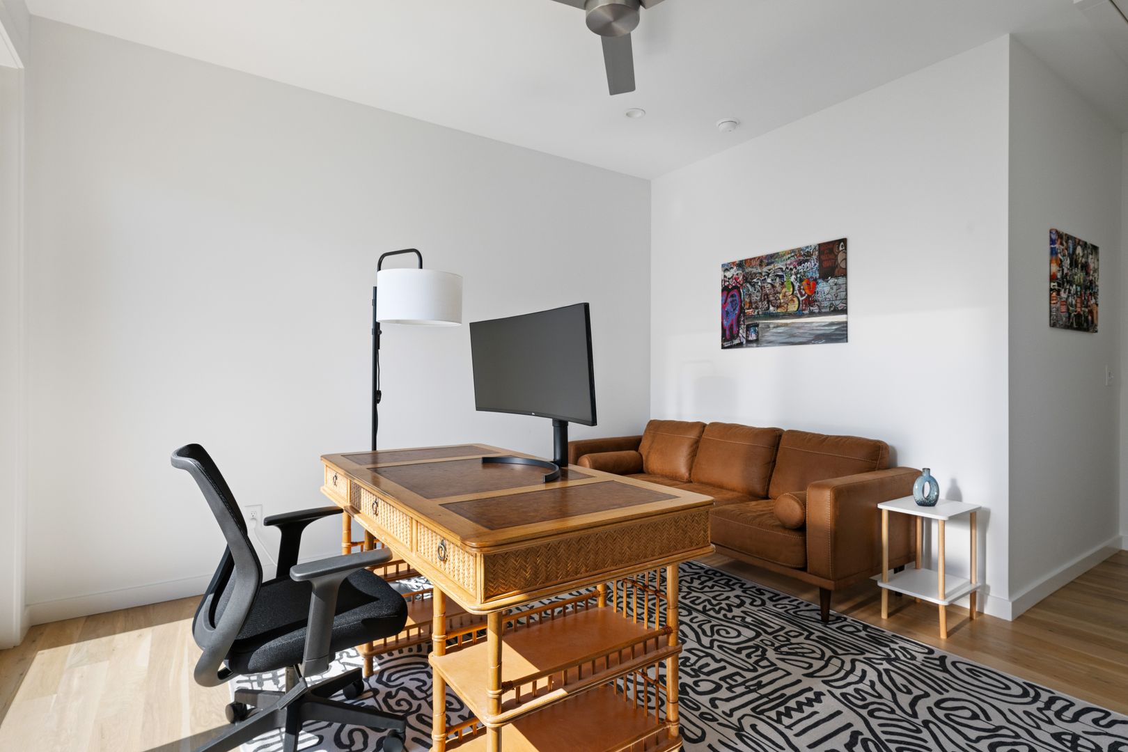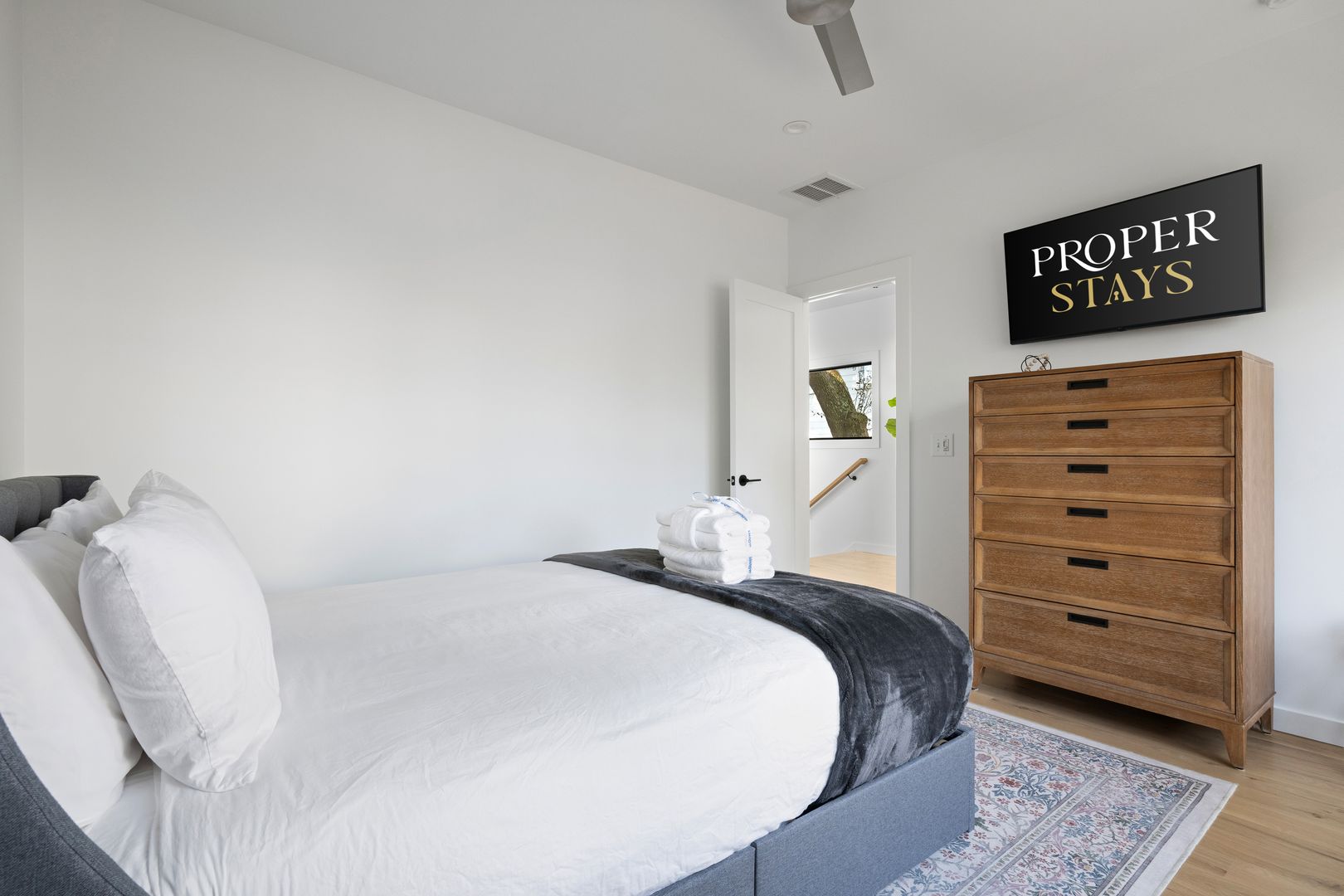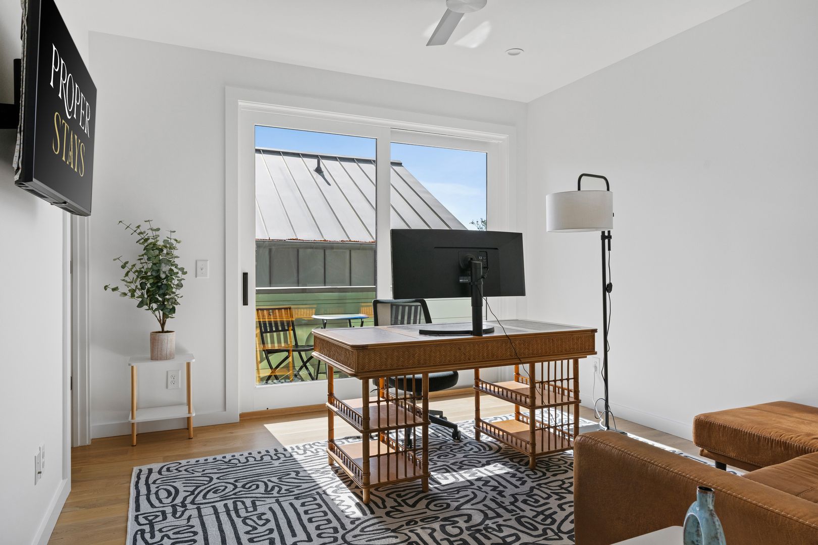 Upstairs, discover two additional bedrooms. The first features a queen size bed and Smart TV, offering comfort and privacy. The middle room is a versatile home office/den with a desk, sectional sofa, Smart TV, and a balcony proving the perfect space for work or relaxation. There is a bathroom that can be accessed from both of these rooms that has a vanity with dual sinks and a shower/tub combination.