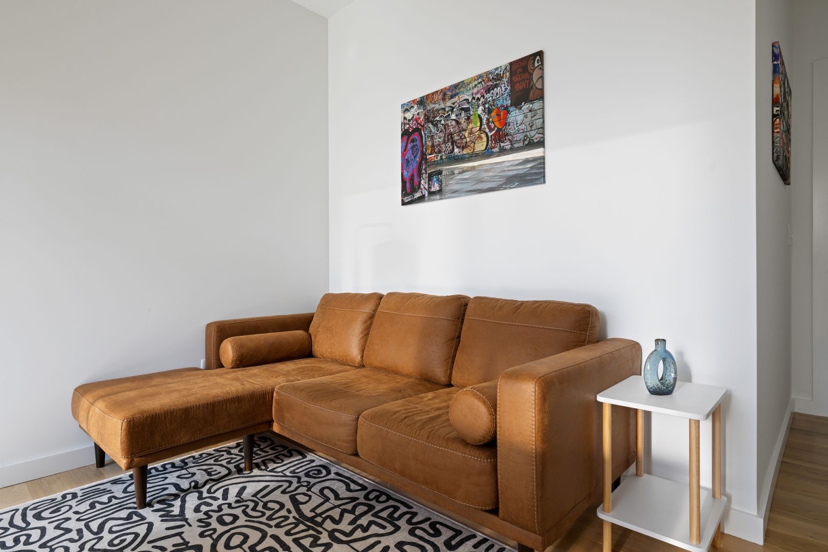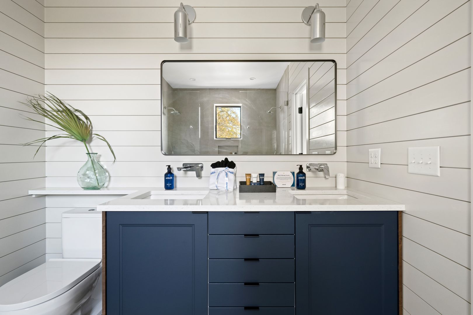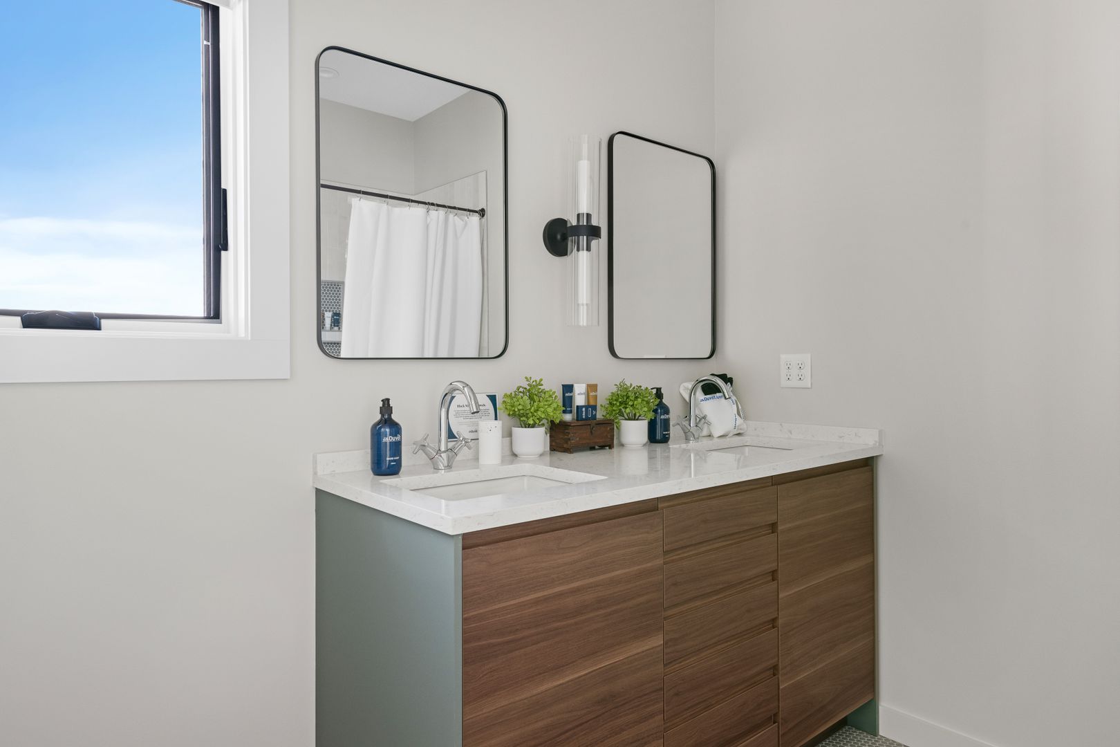 Upstairs, discover two additional bedrooms. The first features a queen size bed and Smart TV, offering comfort and privacy. The middle room is a versatile home office/den with a desk, sectional sofa, Smart TV, and a balcony proving the perfect space for work or relaxation. There is a bathroom that can be accessed from both of these rooms that has a vanity with dual sinks and a shower/tub combination.