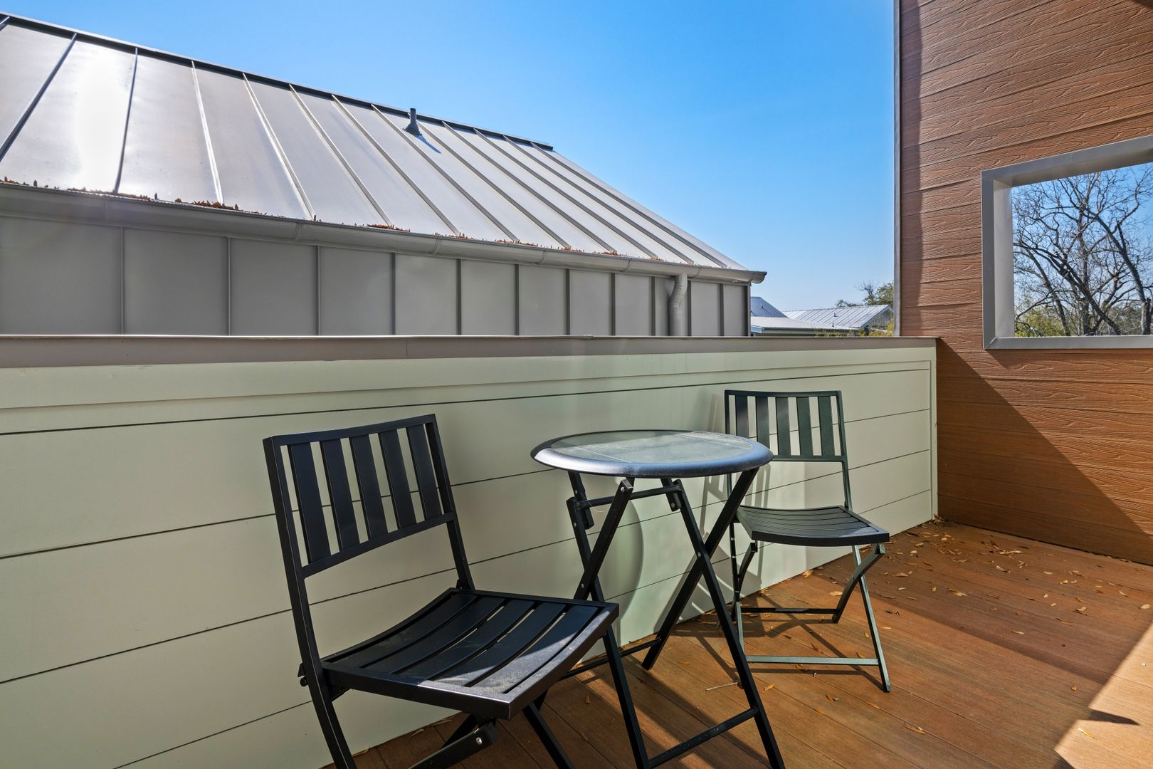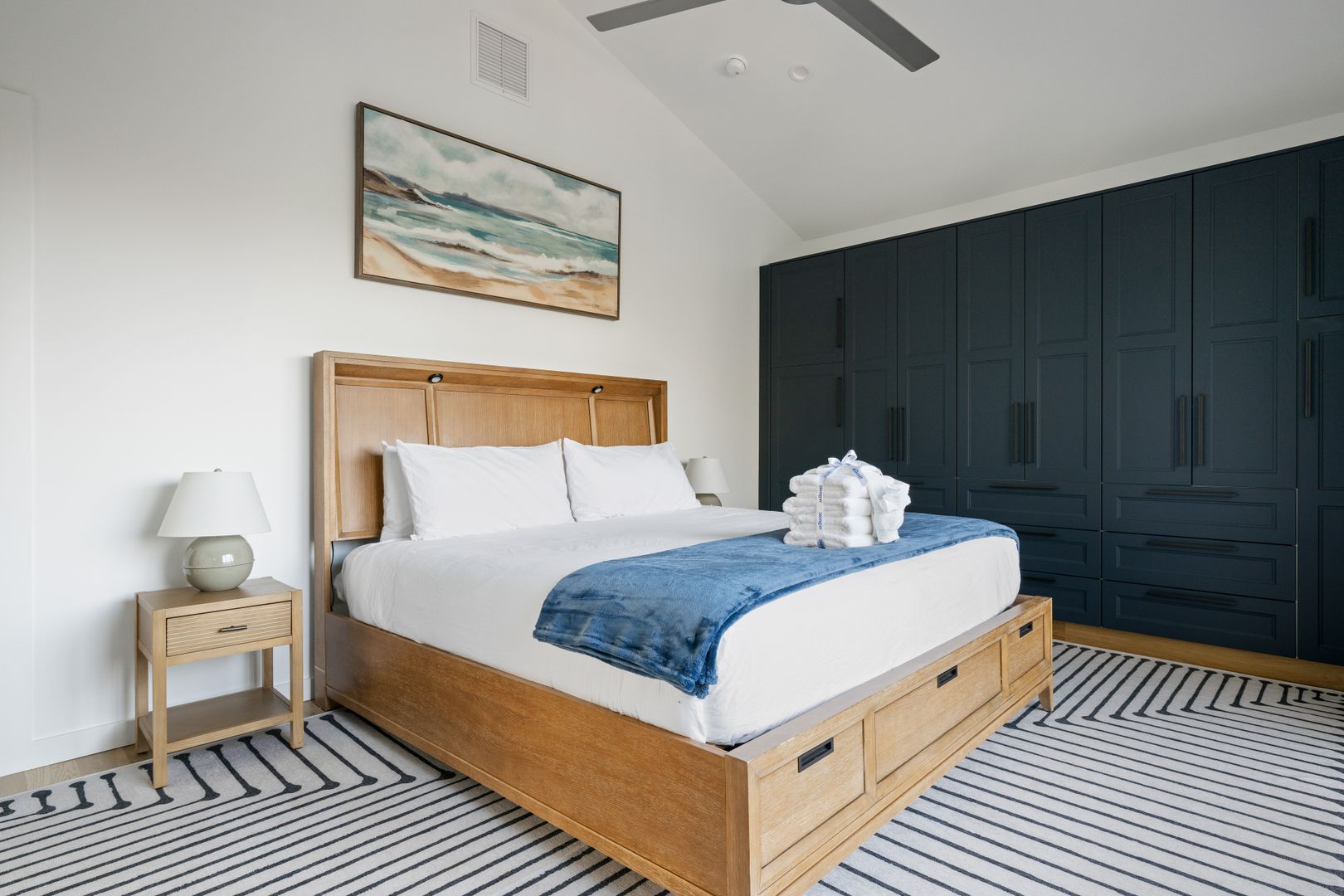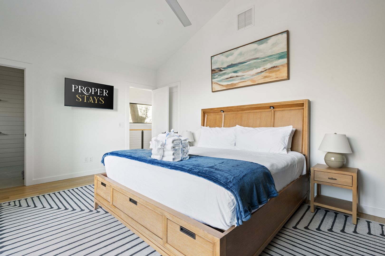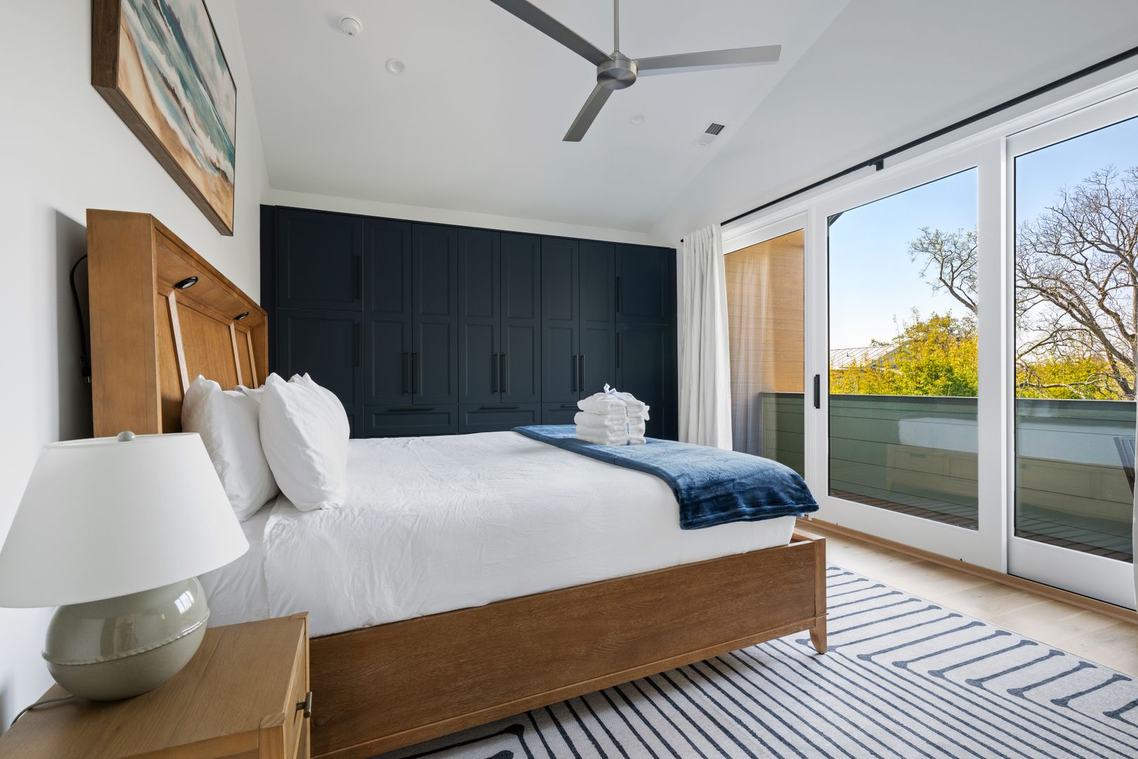 The highlight of the upper level is the lavish master suite, boasting a king size bed with storage, Smart TV, and a spa-like ensuite bathroom with a grand shower featuring dual shower heads and a double vanity. There is also an adorable balcony off of the master with a bistro table and chairs.
