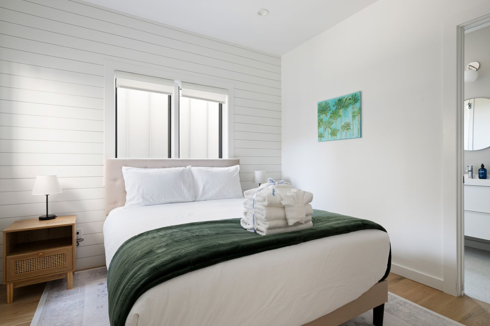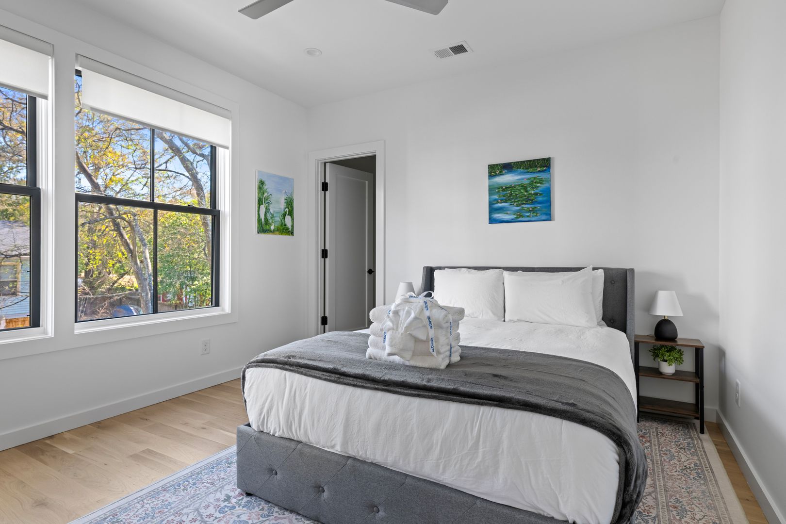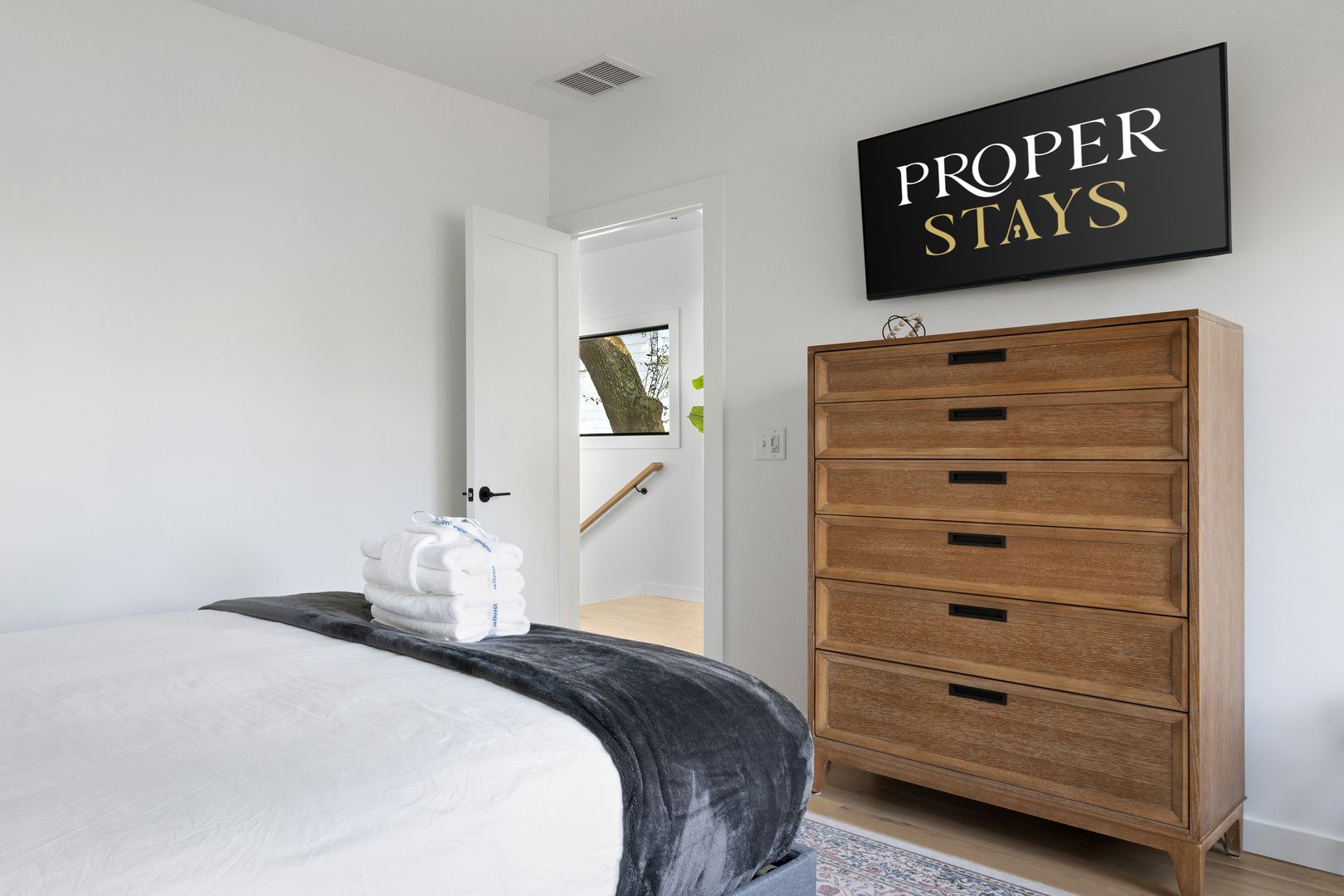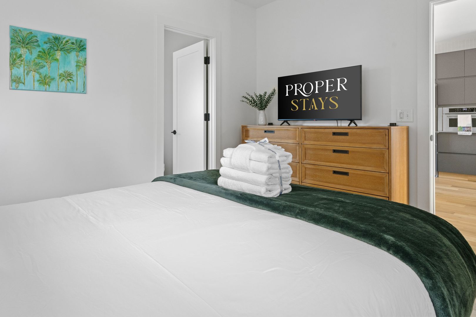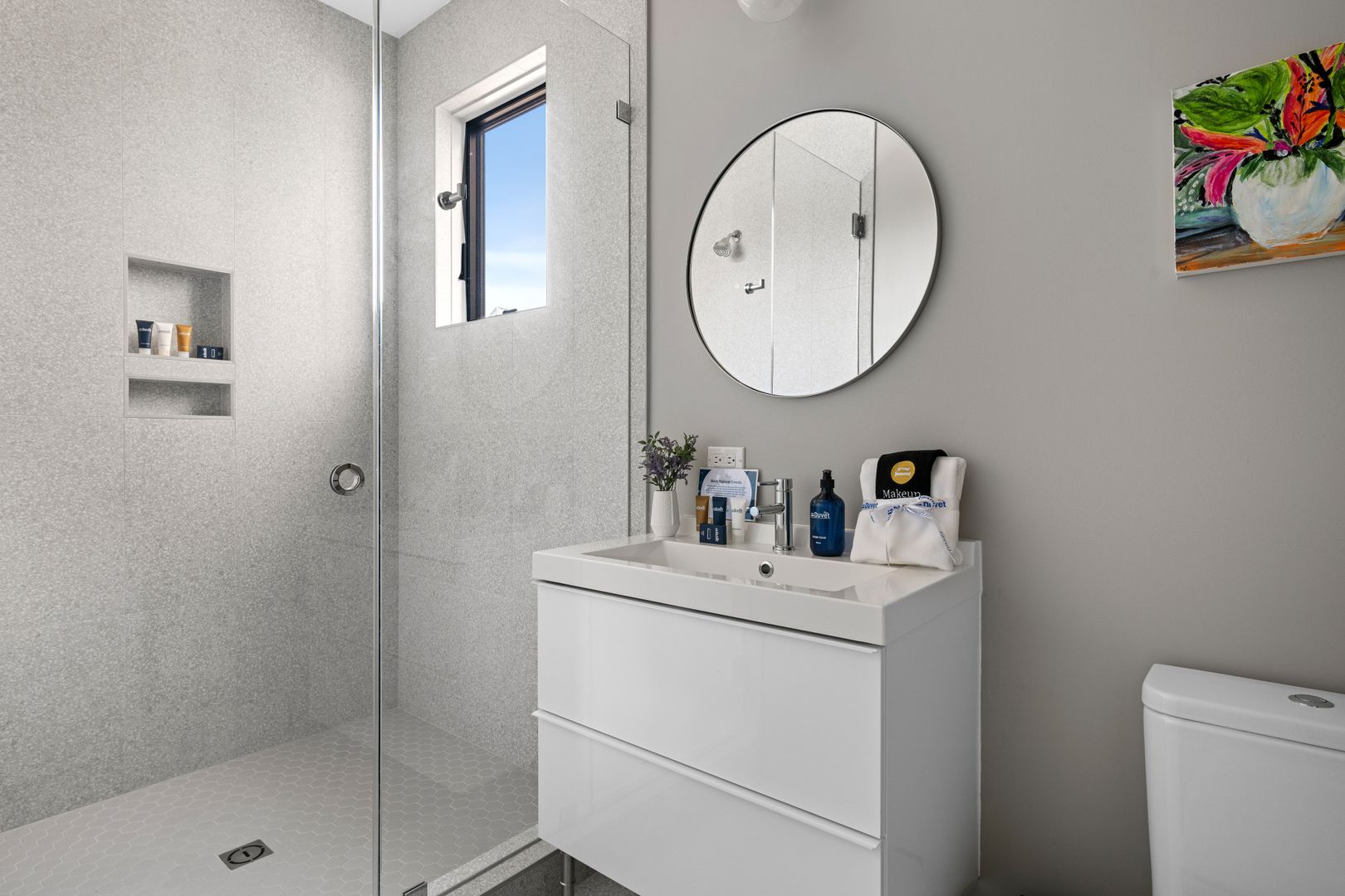 The highlight of the upper level is the lavish master suite, boasting a king size bed with storage, Smart TV, and a spa-like ensuite bathroom with a grand shower featuring dual shower heads and a double vanity. There is also an adorable balcony off of the master with a bistro table and chairs.